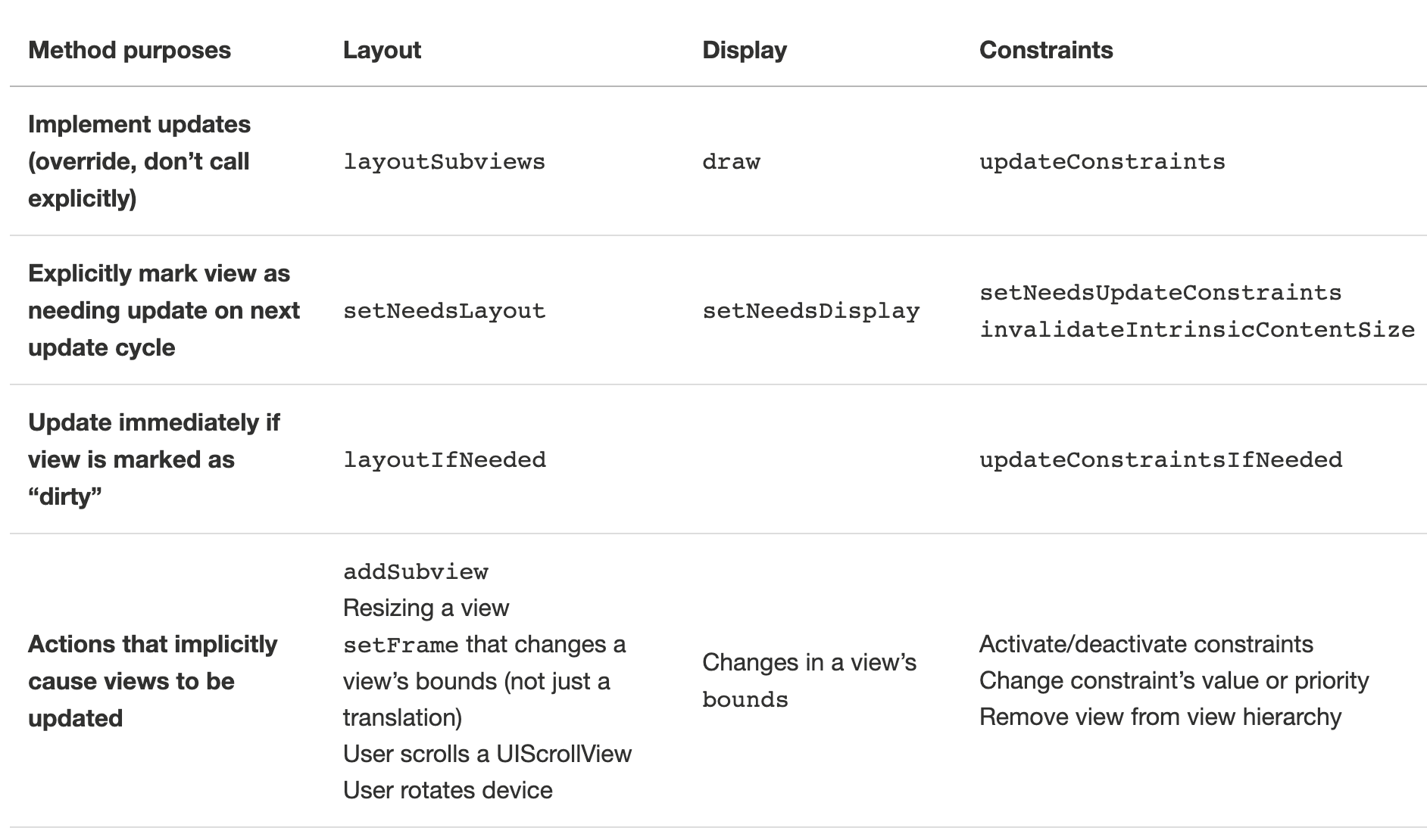 Layout과 Constraint의 업데이트에 관련된 경우, 만약 이러한 update들이 run loop의 종료까지 기다릴수 없을때 ( 즉, 다른 작업이 view의 새 layout에 종속된 경우), “layout updated” 플래그를 설정하게 하는 몇가지 명시적으로 업데이트를 호출 할 수 있는 메서드 들이 있다. 다음은 업데이트가 필요할 수 있는 UI의 각 구성 요소와 관련하여 각 방법을 간략하게 설명한 차트이다.