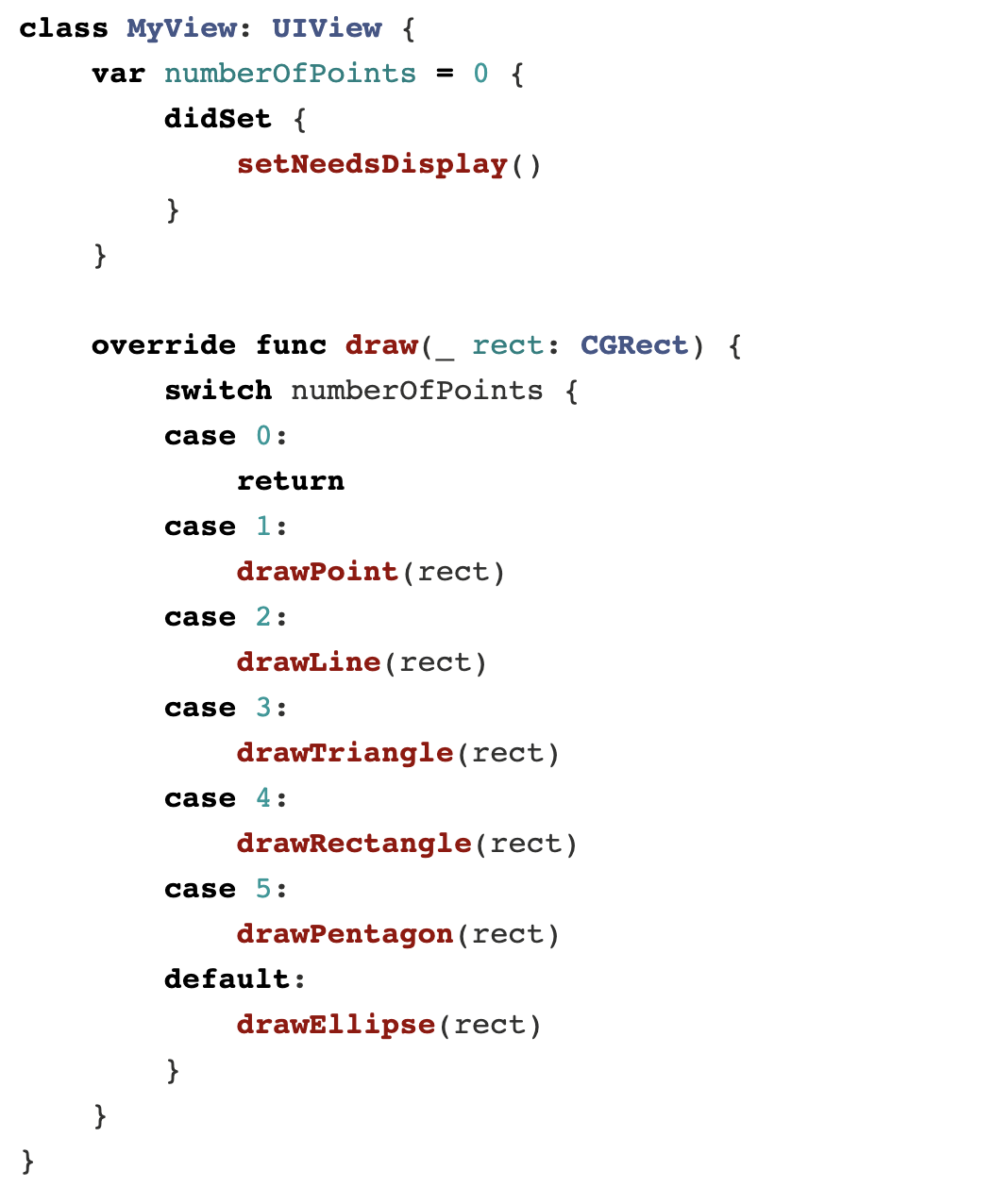 프로퍼티를 설정하기 위해서 custom drawing을 수행해야 하는 경우가 있는데, 이 경우 draw 메서드를 override 해야 한다. 다음 예에서 numberOfPoints를 설정하는 것은 지정된 수의 포인트 ( 꼭짓점 )가 있는 모양으로 시스템이 view를 그리게 유도해야 한다. 이런 경우, property observer ( didSet )으로 setNeedsDisplay를 호출하여 draw 메서드를 호출하여 custom drawing 한다.