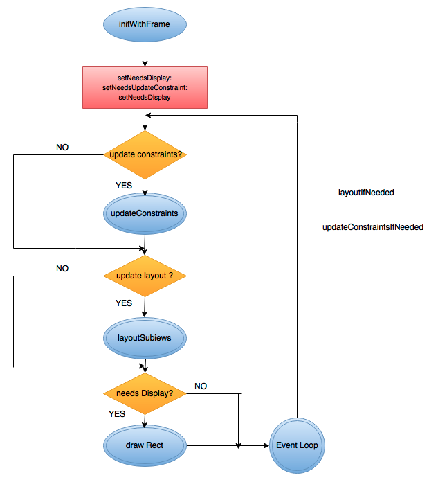 다음 차트는 update cycle과 event loop 간에 상호작용을 요약하고 위에서 설명한 일부 메서드들이 어디에서 해당하는지 나타낸 차트이다. Run loop의 어느 지점에서든 layoutIfNeeded 또는 updateConstraintsIfNeeded를 명시적으로 호출할 수 있으며, 이는 잠재적으로 비용이 많이 든다는 점을 염두에 둬야 한다. 이 루프의 끝에 update cycle이 있으며, 특정 “update constraints”, “update layout”, “needs display” 플래그가 설정된 경우 constraints, layout, display를 업데이트한다.