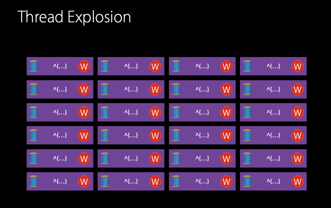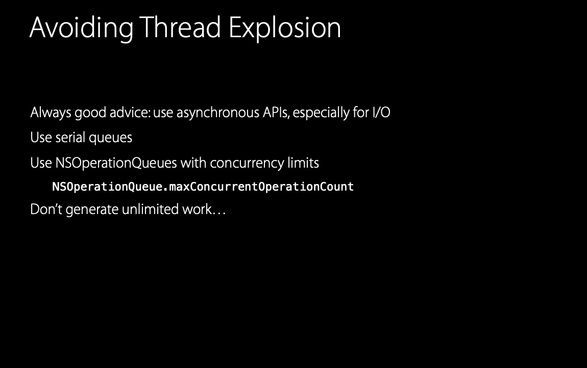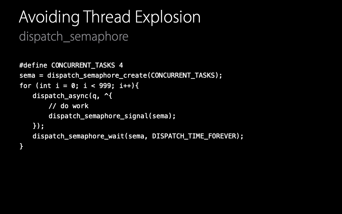 그리고 NSOperation queue 도 사용할 수 있다. 그리고 작업을 무제한으로 생성하지 말아야 한다. 작업의 블록 수를 제한적으로 설계할 수 있다면, 스레드 폭발을 방지할 수 있다.