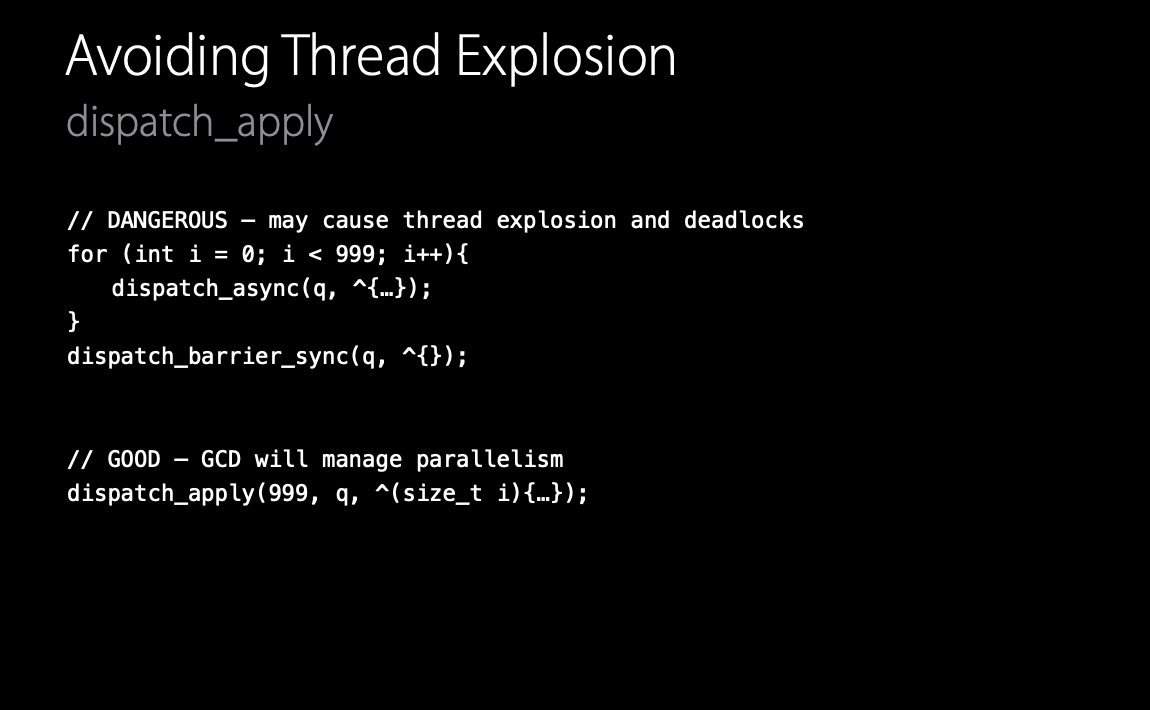 하지만 dispatch apply라는 원시 타입이 있다. 이것은 GCD가 병렬성을 관리하고 위 문제를 피할 수 있다.