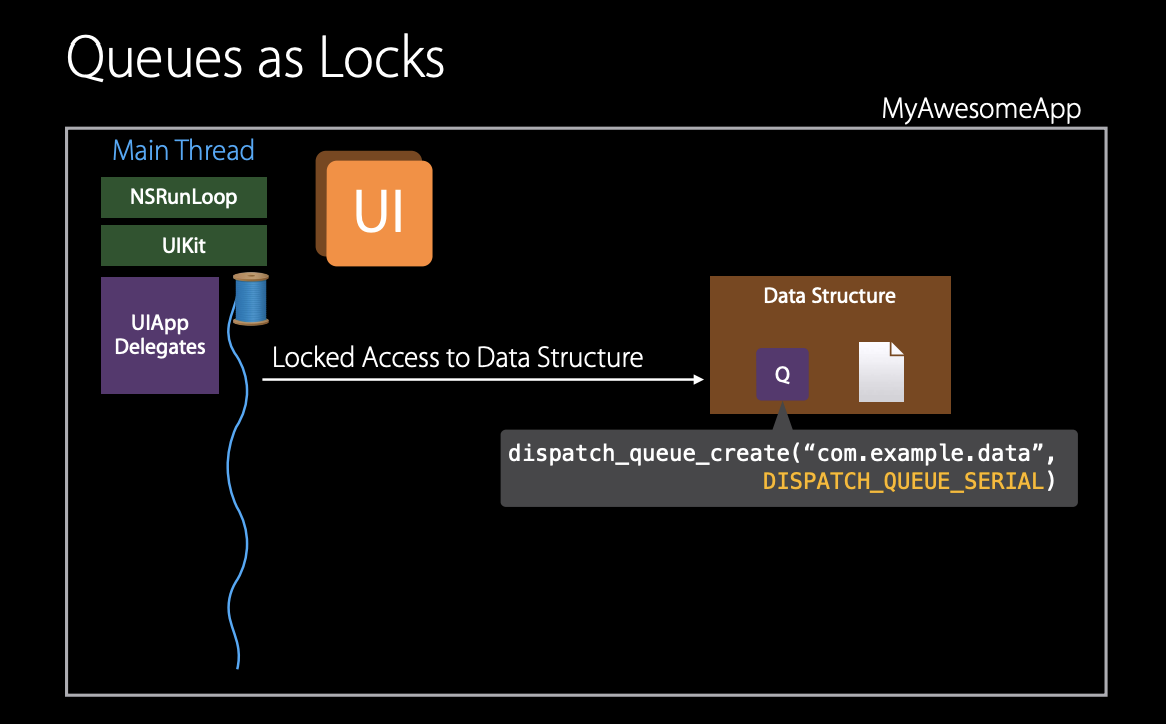 마지막 예시는 GCD의 직렬(serial) 큐를 lock(잠금기능)으로 사용하는 것이다. 앱에서 공유 데이터 구조를 가지고 있다면, 이에 대한 동시 접근을 제어하기 위하여 잠금 접근을 원할 것이다. 이 경우 dispatch serial queue를 생성하여 dispatch sync를 사용하여 큐에 작업을 추가하는 스레드가 큐에 대한 잠금을 얻어 데이터 구조에 독점적으로 접근할 수 있도록 보장한다.