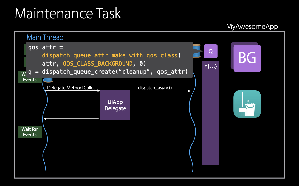 또 다른 예는 데이터베이스에 많은 느슨한 객체가 있다면, 압축, 정리 작업과 같은 background queue에서 실행되어야 하는 유지보수와 같은 작업이 필요하다. 이 작업은 userInteractive 작업이 필요하지 않다.