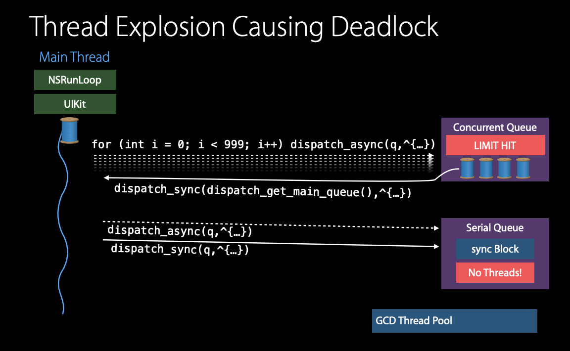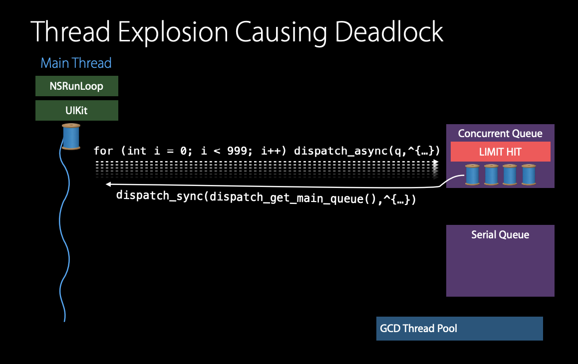 문제는 현재 serial queue에 가용 가능한 스레드가 없다. 이 말은 dispatch sync call 은 영원히 막히게 된다.