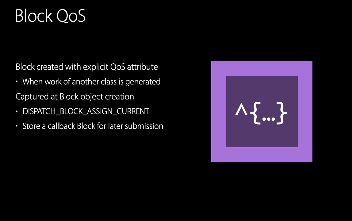 또한, 블록 내에서 QoS Class를 캡처하여 저장하고, 다른 스레드나 큐에서 나중에 해당 블록을 실행할 때 저장된 QoS Class 를 사용할 수 있다. dispatch block assign current flag 는 현재 QoS Class 를 콜백 블록에 저장하고 나중에 다른 스레드나 큐에 제출됐을 때, 알맞은 QoS로 전파하여 실행하도록 한다.