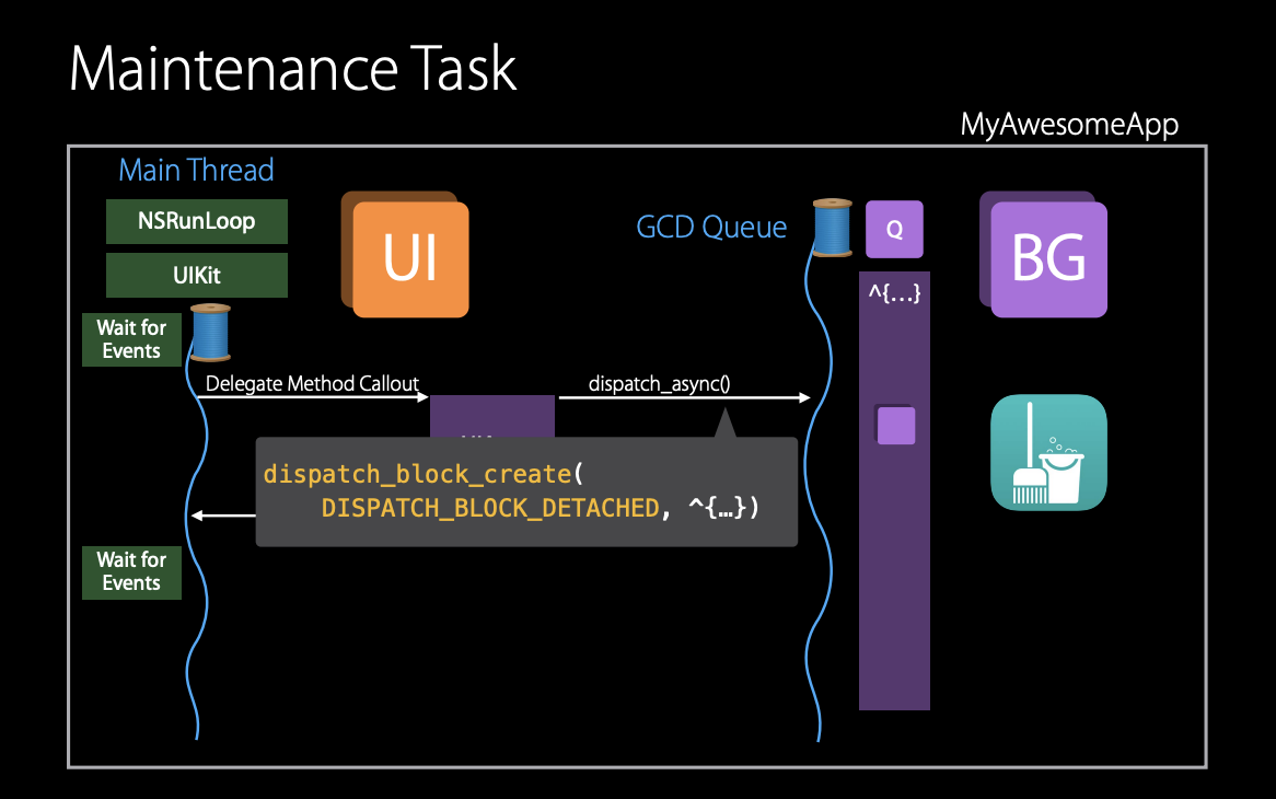 이와 같은 실행 흐름과 관련이 없는 유지 관리 작업의 경우 dispatch block detached 플래그를 사용하는 것이 적절할 수 있다. 이는 운영 체제에게 수행하는 작업이 실행 흐름과 관련이 없음을 알린다.