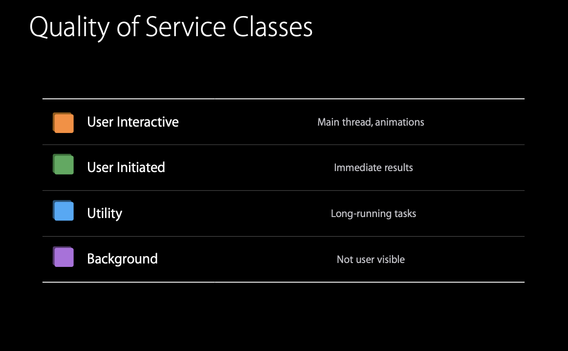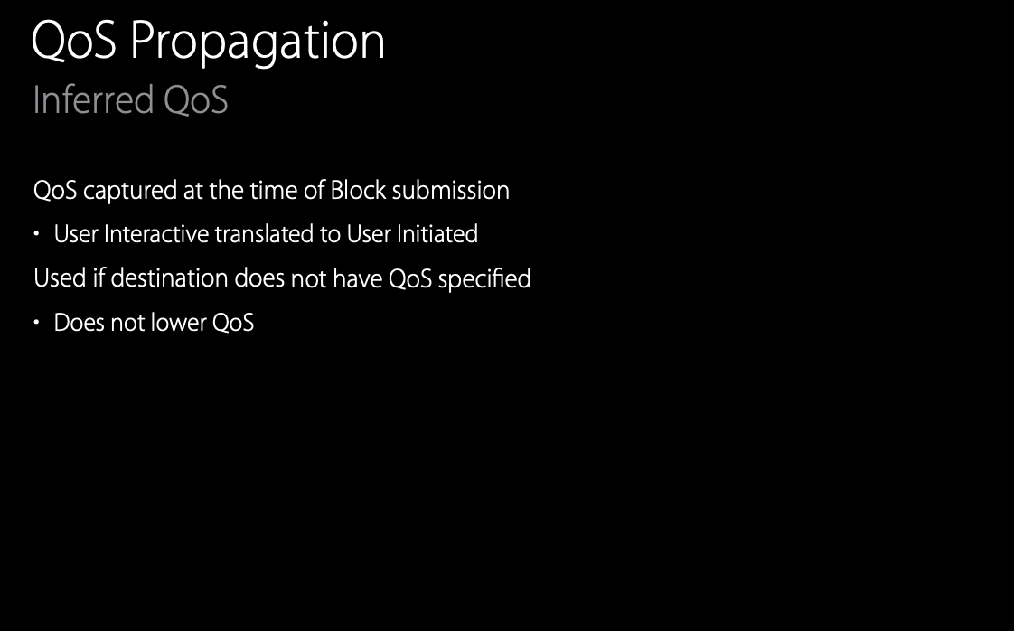 큐에 블록이 제출되는 타이밍에 캡처된 QoS를 특별한 규칙으로 userInteractive를 userInitiated로 변환했다. 이 propagated QoS는 블록이 제출되는 곳에 자체 QoS가 설정되어 있지 않은 경우에 사용되며, 자체적으로 높은 QoS가 설정되어 있는 메인 스레드로 이동하더라도 QoS가 낮아지지 않는다.