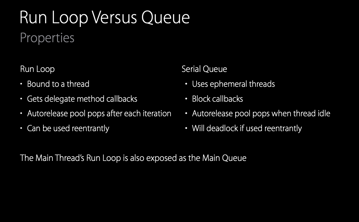 이는 런 루프와 dispatch queue 기반 API를 혼합하여 사용하는 경우 발생할 수 있다. 간단히 런 루프와 직렬 큐간 차이점을 설명하자면, 런 루프는 특정 스레드에 바인딩되어, delegate 메서드의 콜백을 받는다. 또한 각 루프 반복 후 자동으로 autorelease 객체를 해제한다. 그리고 재진입이 가능하다. 이는 런 루프에서 호출된 외부 코드에서 다시 런 루프를 실행할 수 있도록 한다.