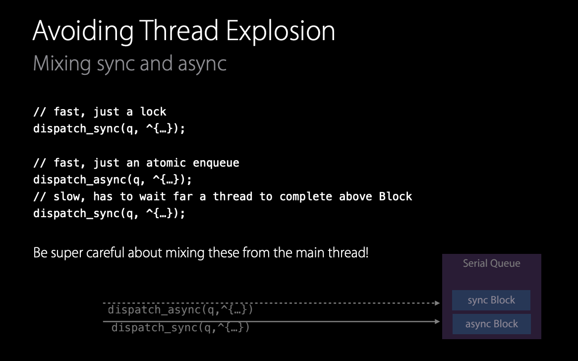 이것들 중 하나의 큐만 사용했다면, 성능은 기본적인 원시 타입과 비슷할 것이다. 그러나 이 둘을 혼합하면 문제가 발생한다. 예를 들어, dispatch async로 큐에 블록을 추가한 후 dispatch sync를 수행하면, 새로운 스레드를 생성하고 해당 블록을 실행하고 완료될 때까지 대기해야 한다.