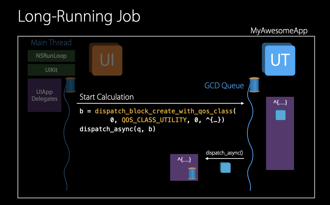 위 예제는 메인 스레드에서 GCD 큐에서 비동기 작업을 수행하고 I/O를 수행한다. 좌측에는 메인 스레드가 있고 여기서 UI 렌더링 및 이벤트 처리가 발생한다. 적절한 QoS는 user interactive일 것이다.