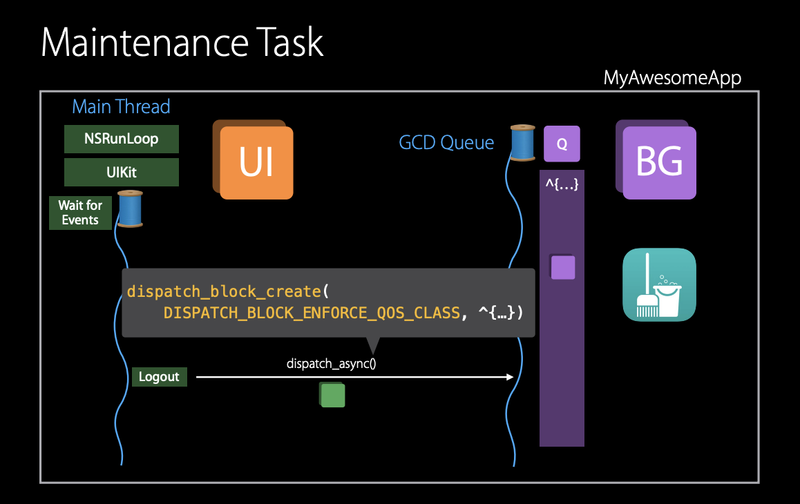 따라서 queue QoS는 앱에서 단일 목적으로 사용되는 큐나 제출된 작업들의 QoS보다 큐의 QoS가 더 중요한 경우에 적합하다. 따라서 유지보수와 같은 background 작업에 대해서는 detached block API를 사용하여 queue를 생성하고 해당 queue의 QoS를 background로 설정하는 것이 좋을 것이다.
