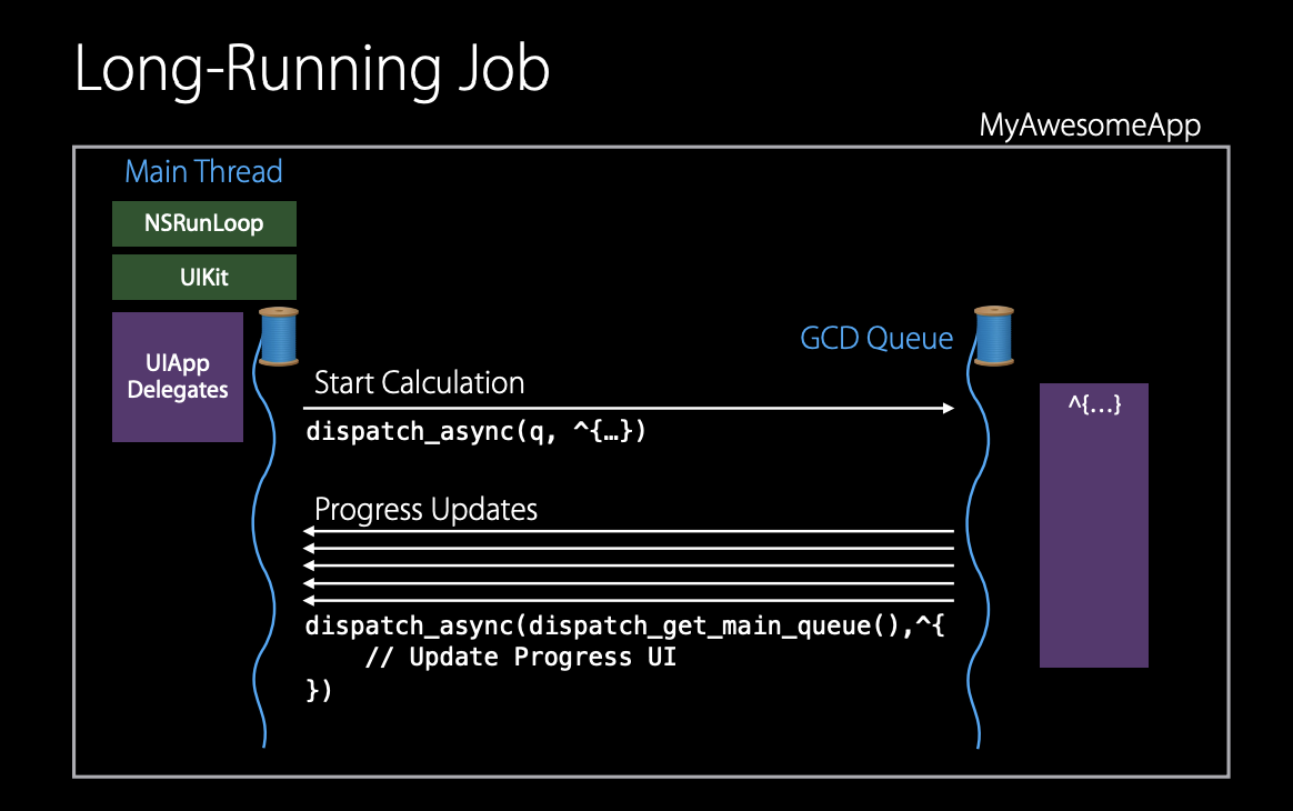 다음 예시는 자동으로 열리지 않는 긴 작업이다. 이는 메인 스레드에 떨어진 상태에서 긴 계산 작업을 실행하여 메인 스레드를 방해하지 않도록 한다. 업데이트 시엔 비동기적인 back block을 통하여 UI를 업데이트한다.
