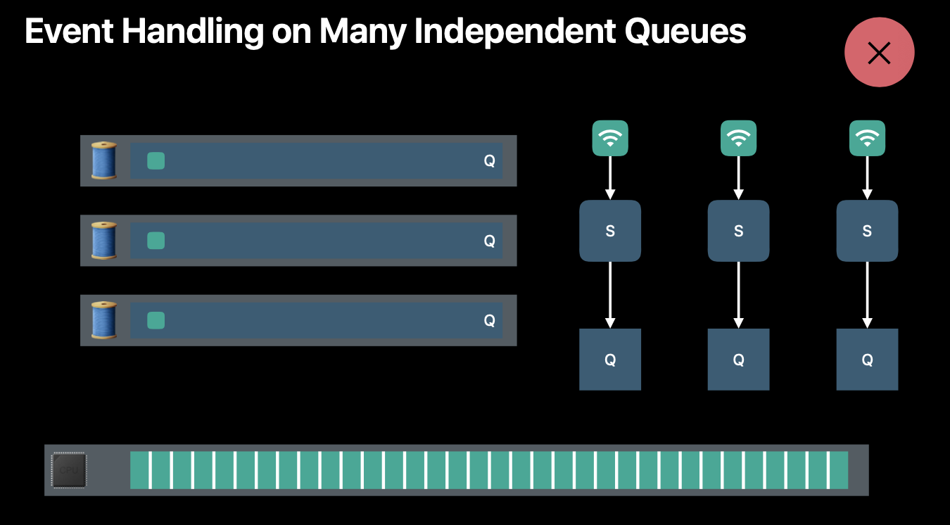 그러나 위와 같은 하나의 네트워킹 관련 이벤트 핸들러를 각각의 대상 queue에 넣는 방식은 바람직하지 않다. 이것이 동시에 활성화되면, 시스템은 각 이벤트 핸들러를 실행하기 위해 각각의 스레드를 생성할 것이다.