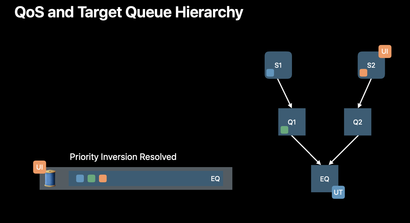 위와 같은 EQ queue는 utility QoS이고, EQ queue에 userinitiated QoS인 Q1의 작업이 제출되고, userInteractive QoS인 S2의 작업이 제출된 상태이다. → priority inversion(우선순위 역전) 상태이다.