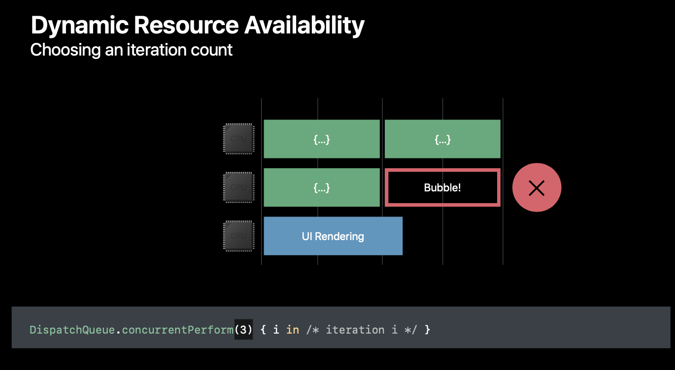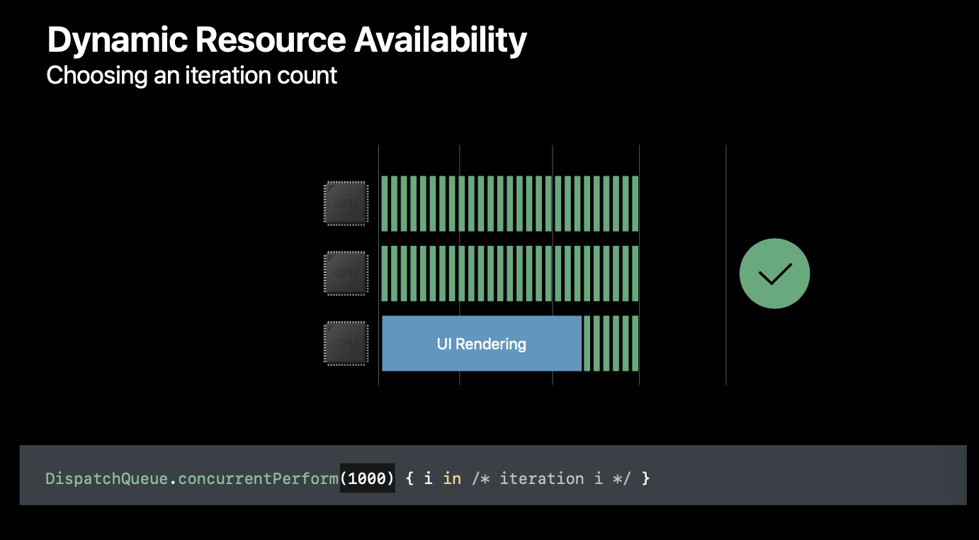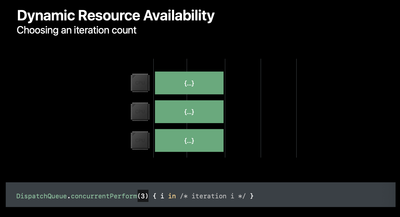 결국 시스템의 사용 가능한 리소스를 최대한 활용할 수 있고, 각 concurrentPerform블록 내에 수행하는 작업의 균형을 유지하는 선에서 유연성을 갖도록 충분히 큰 반복 횟수를 사용하는 것이 바람직하다.