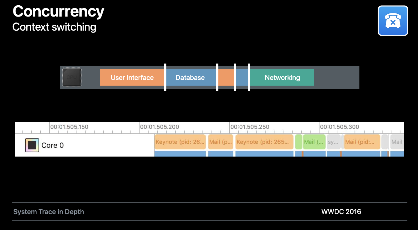 위 CPU에서 흰 줄들은 서브 시스템 간 전환을 나타낸다. Instrument System Trace를 사용하여 이것을 시각화하여 확인할 수 있다. (WWDC 2016 - System Trace in Depth를 참고)