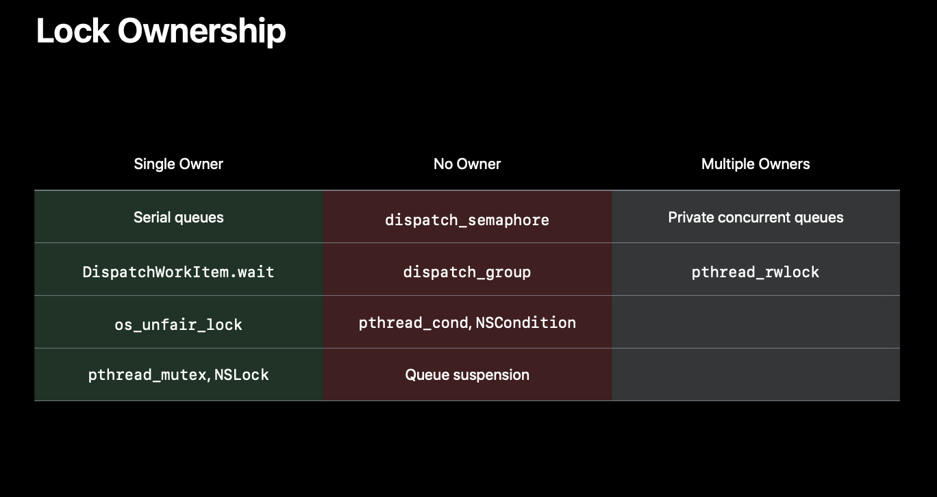 그러나 dispatch semaphore와 dispatch group과 같은 asymmetric primitive(비대칭적 기본요소)는, 런타임이 블록킹 된 스레드를 풀어줄 수 없기 때문에 위에서 언급한 single known owner의 권한을 가지지 못한다.