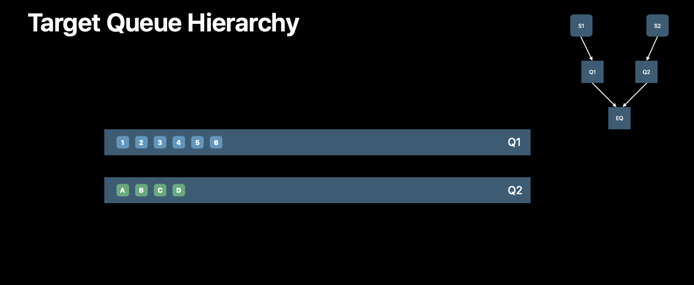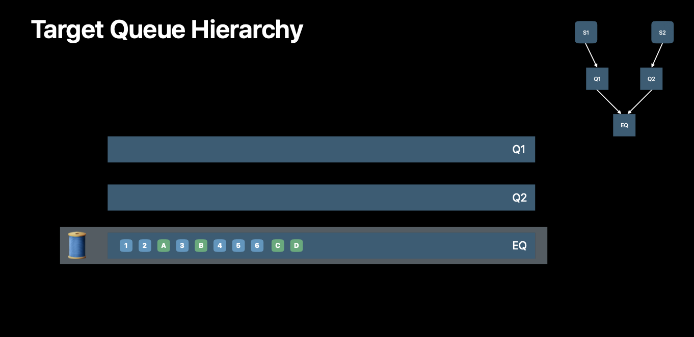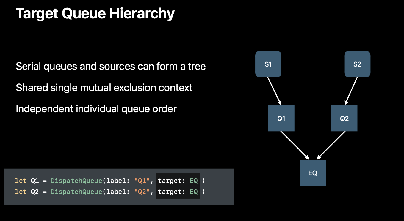 두 개의 source인 S1과 S2, 두개의 queue인 Q1, Q2가 있고 이들을 동기화해 줄 serial queue인 EQ가 있다. 이를 구현하기 위해 DispatchQueue 생성자에 옵셔널 매개변수로 EQ를 전달하는 방법을 사용한다. 이를 통해 소스 중 하나 또는 한 번에 하나의 큐 만 실행할 수 있다.