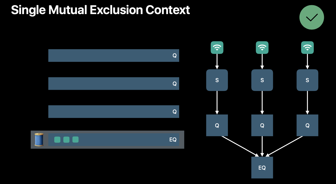 이러한 상황을 개선하는 방법으로 맨 아래에 추가적인 serial queue를 생성하여 모든 네트워크 연결에 대한 동기화 context를 얻도록 할 수 있다. 이후 동시에 발생하게 되면, EQ에 인큐 되고 순서대로 하나의 스레드가 작업을 실행하게 된다.
