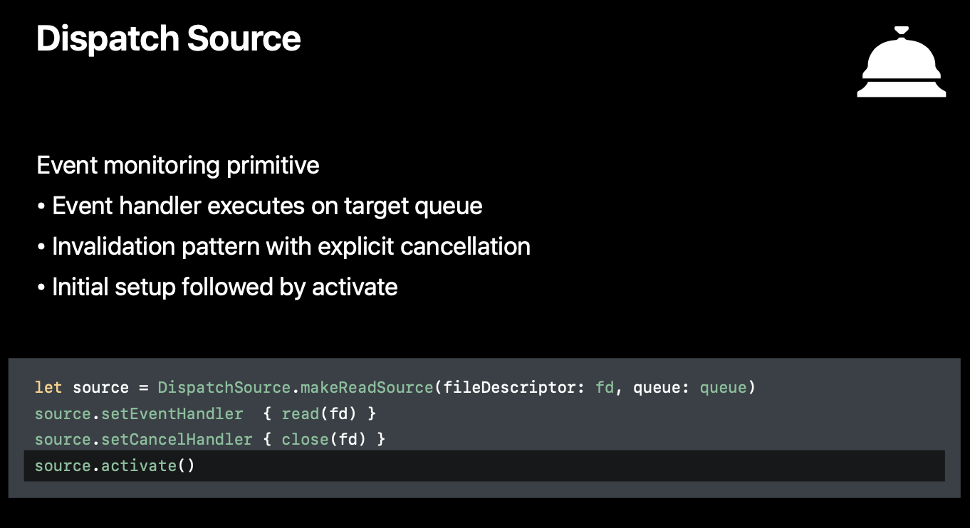 DispatchSource.makeRead를 통해 읽기 가능한 파일 디스크립터를 모니터링하도록 설정하고 소스의 대상 큐인 실행 대상 큐를 전달한다. 이곳에서 소스 이벤트 핸들러가 실행되며 여기서는 파일 디스크립터에서 읽는다. 이 대상 큐는 읽은 데이터를 처리하는 등이 이 작업과 직렬화되어야 하는 다른 작업을 넣을 수 있는 곳이다. 이후 무효화 패턴을 구현하는 setCancelHandler를 설정하고 activate을 호출하여 모니터링을 시작한다.