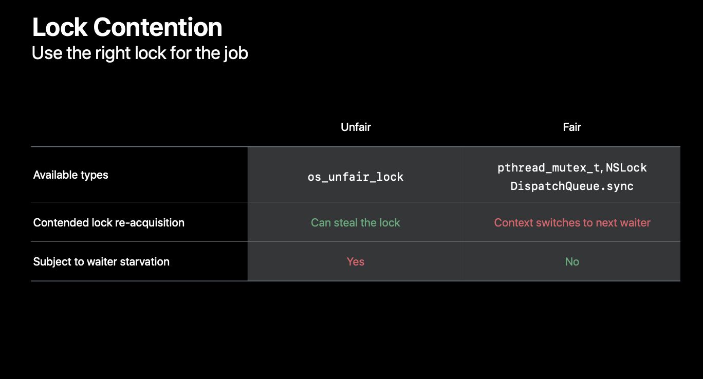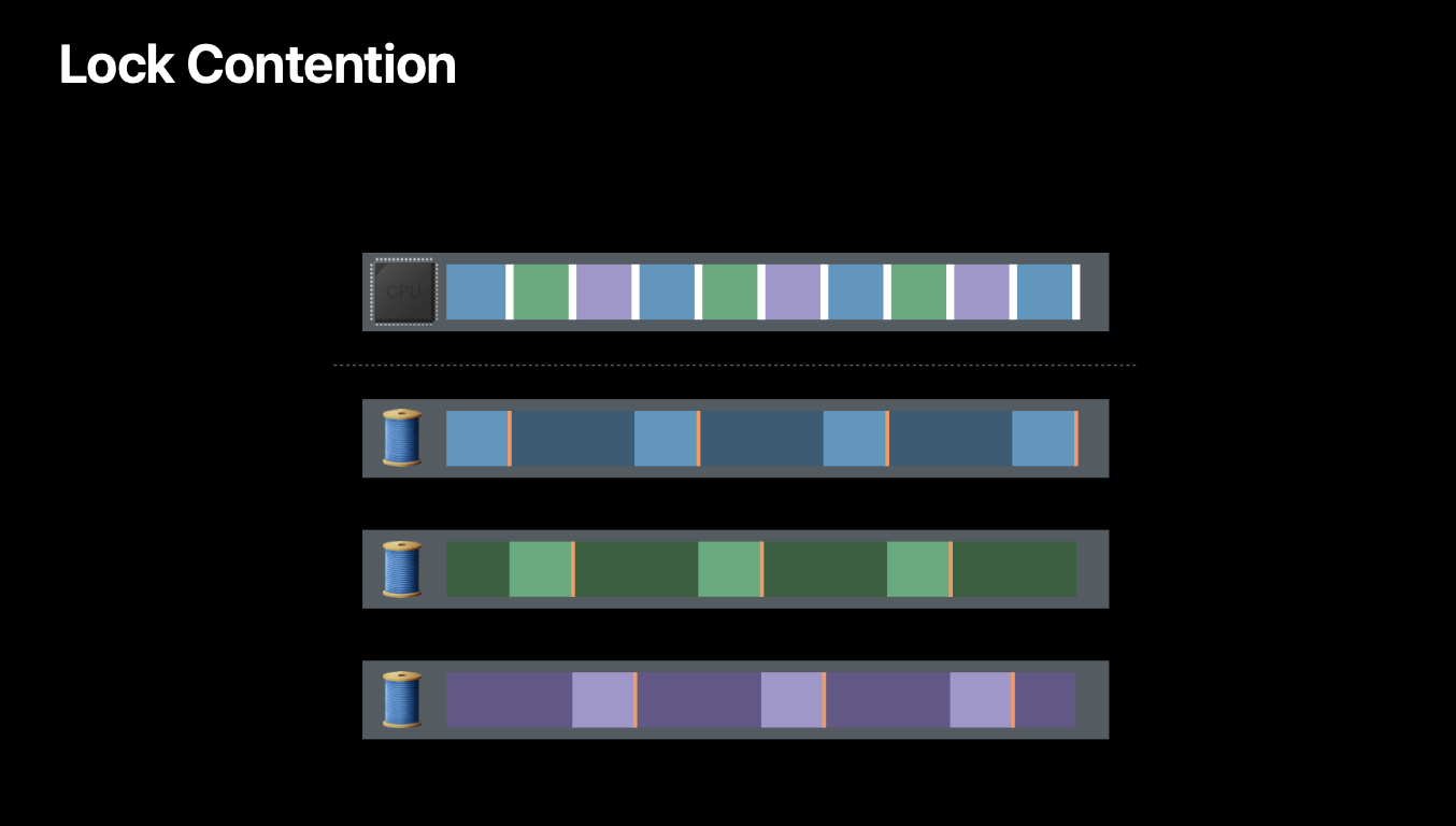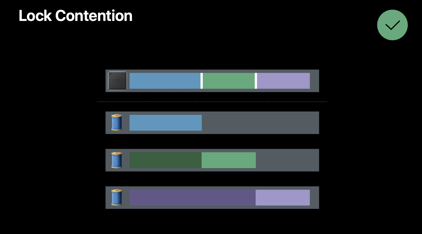 이러한 비효율적인 동작은 코드에서 쉽게 찾을 수 없기 때문에 Instuments System Trace에서 앱의 실제 동작을 시각화 하고, 올바른 lock을 사용할 수 있도록 해야 한다.