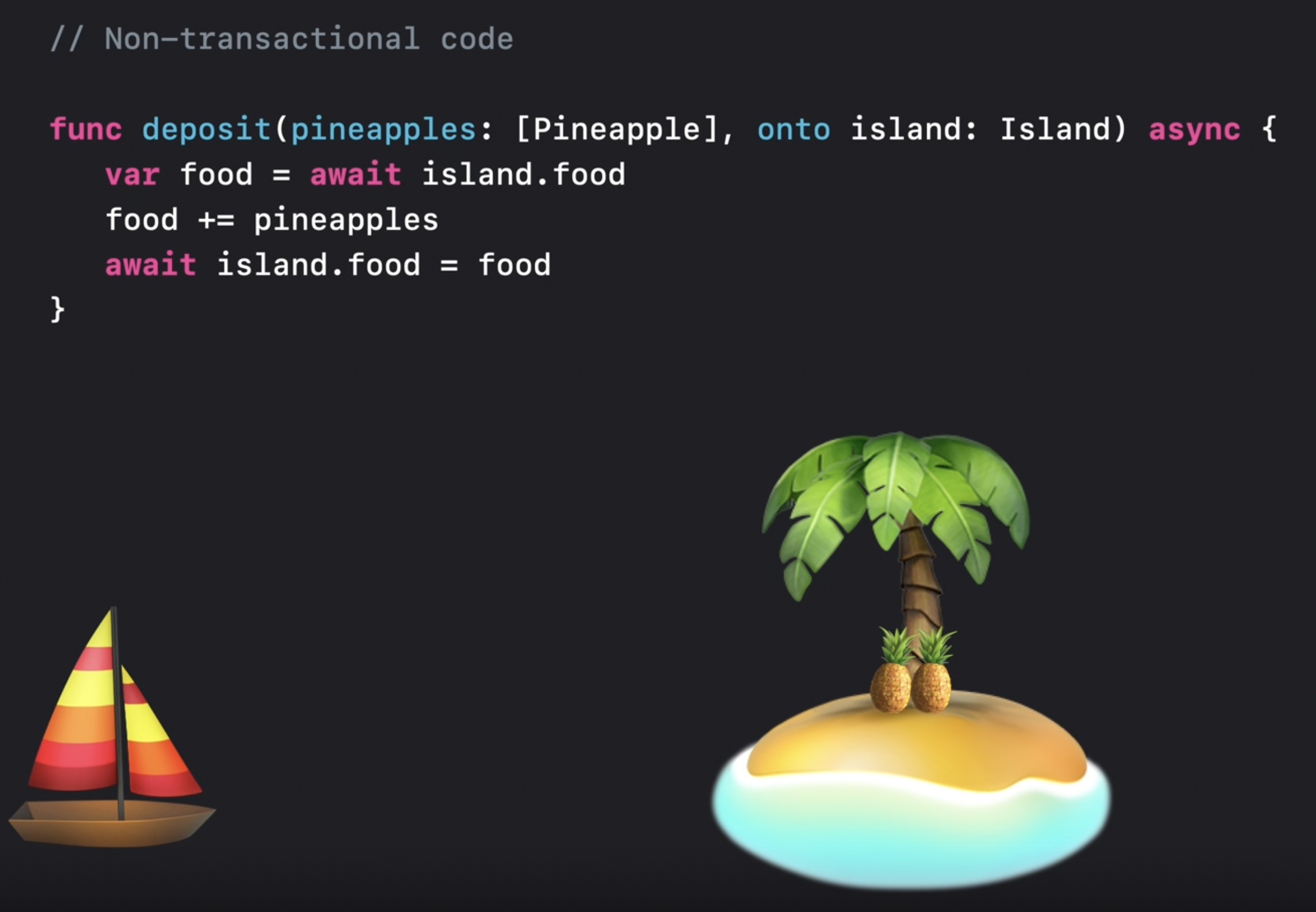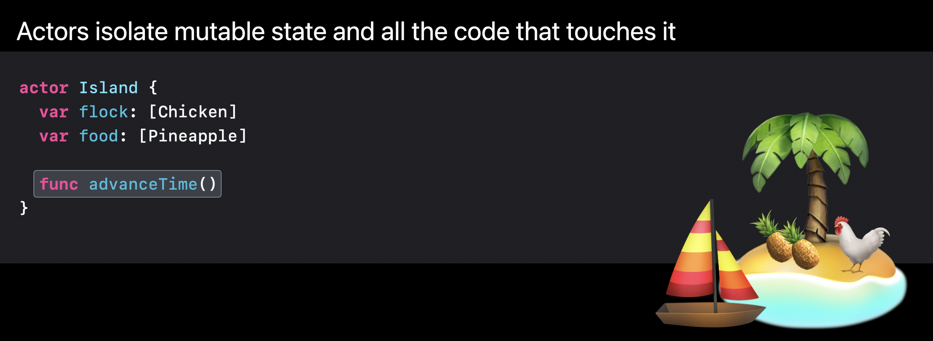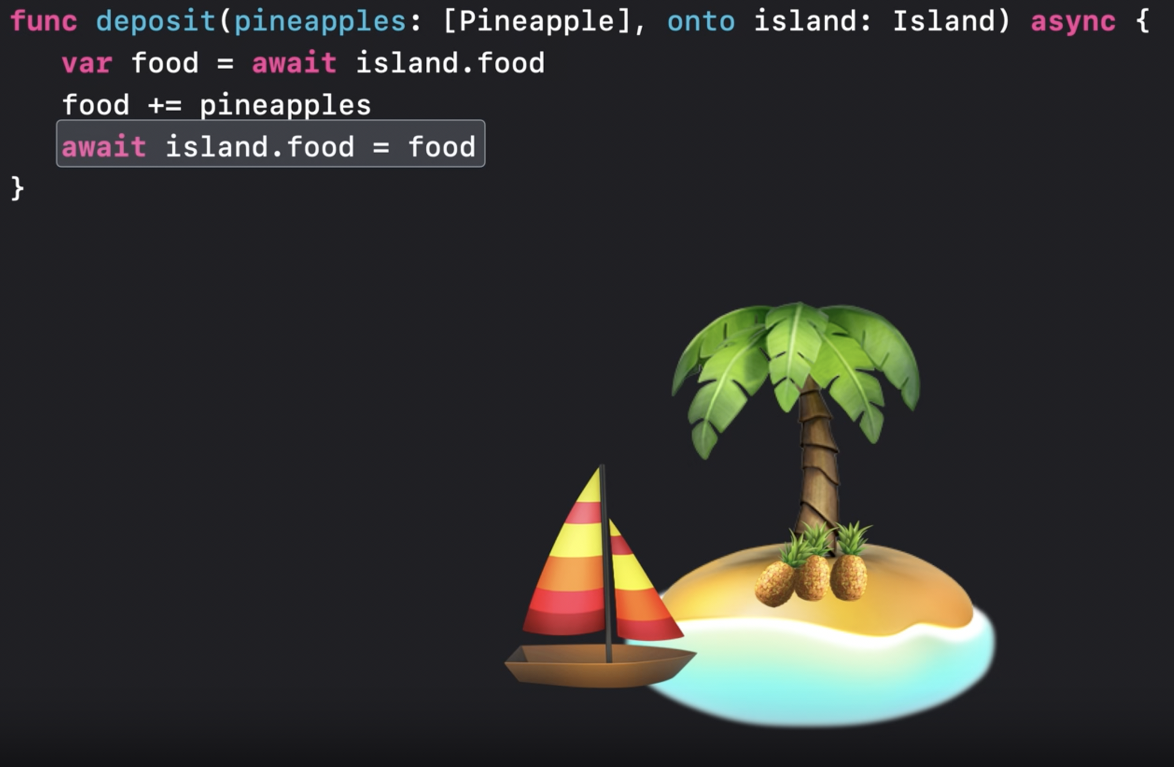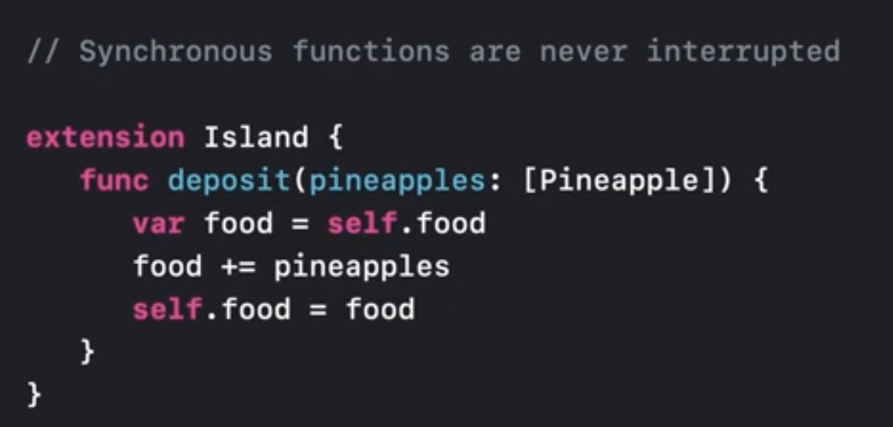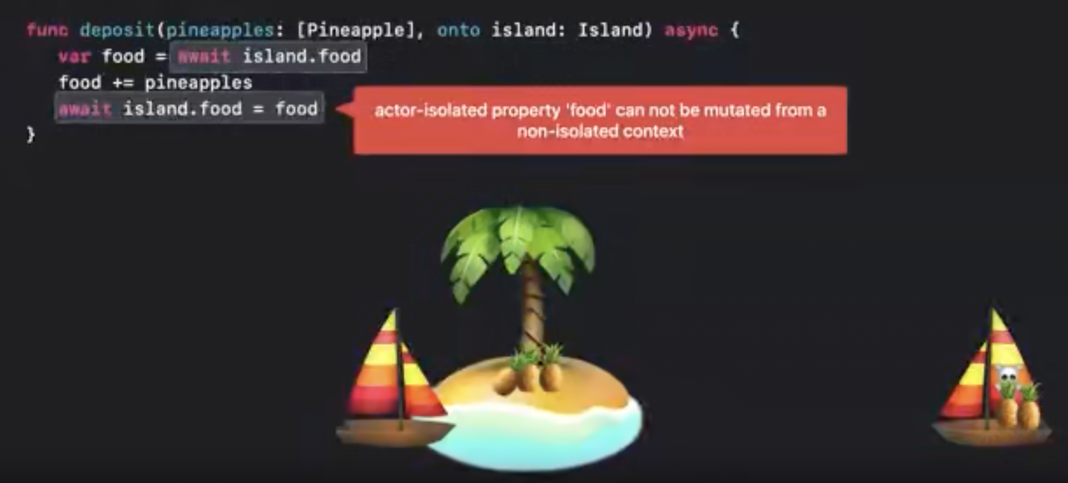 이것은 동기 코드이기 때문에 actor에서 중단 없이 실행된다. 따라서 함수 전체에서 섬의 인스턴스가 다른 누구에 의해 변경되지 않을 것임을 확신할 수 있다.
