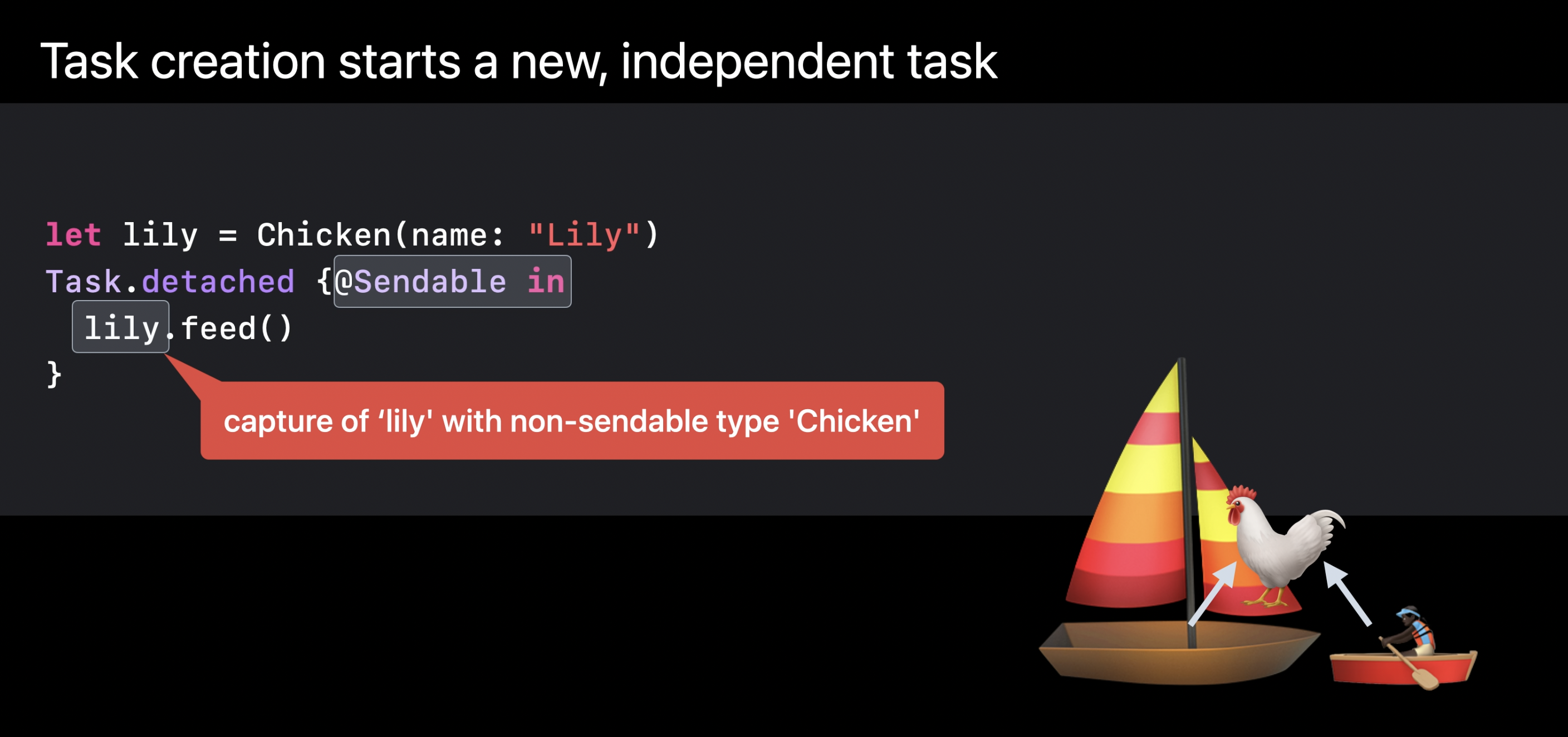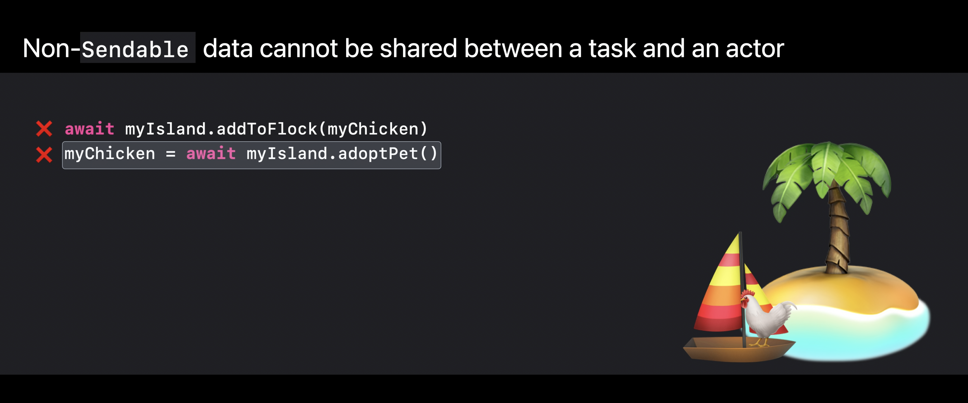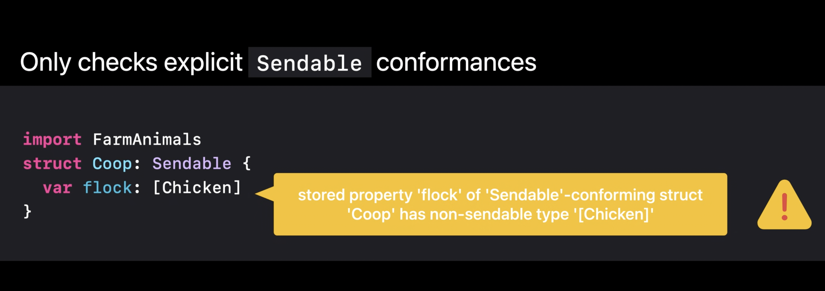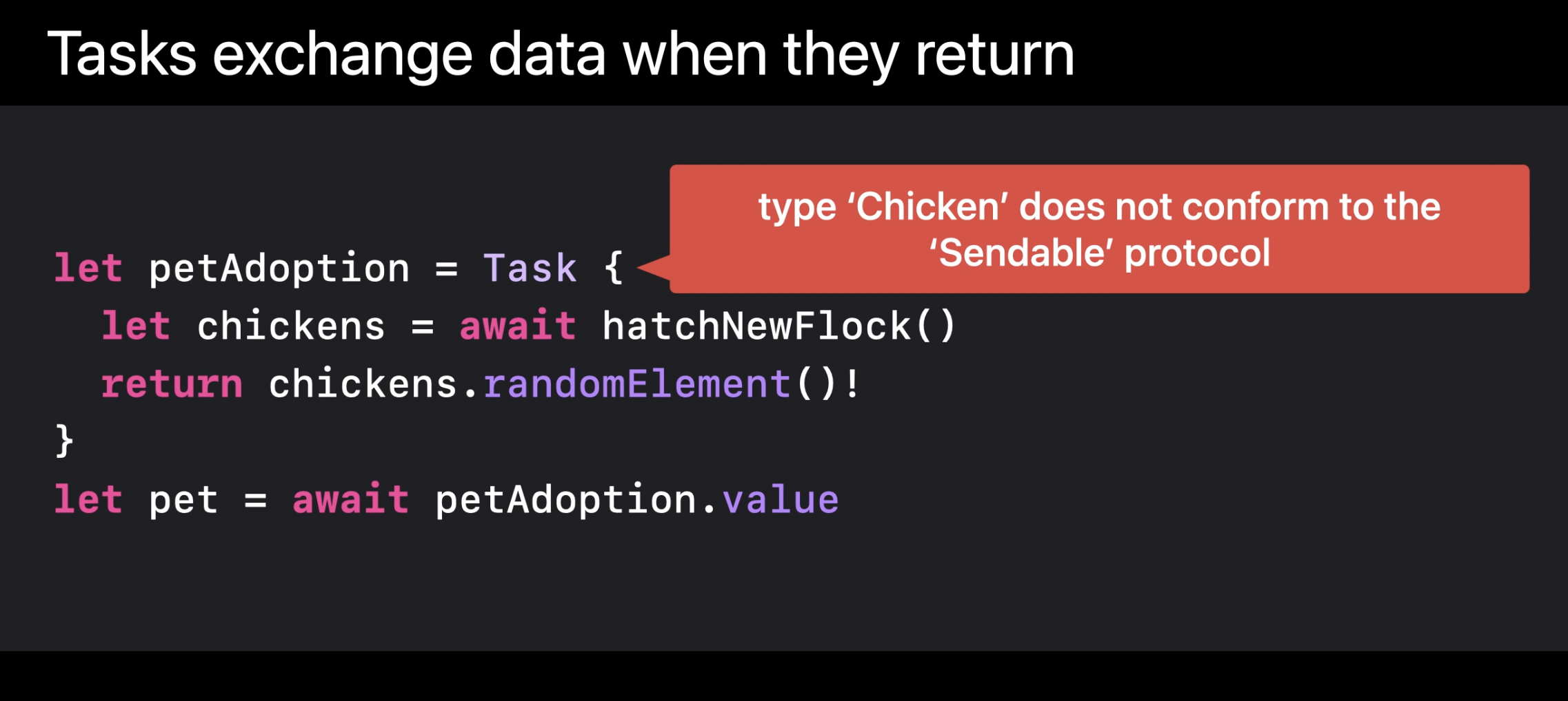 예를 들어 보트에 있는 닭을 섬에 있는 닭 무리에 추가하려 하거나, 섬에서 닭을 입양하여 보트에 가져가려 하면 Sendable 검사를 통해 컴파일러는 두 격리 구역에서 객체를 공유하려는 시도를 차단한다.