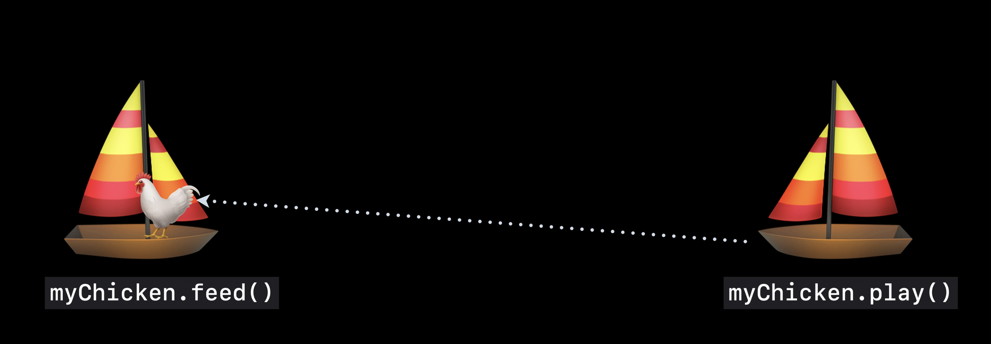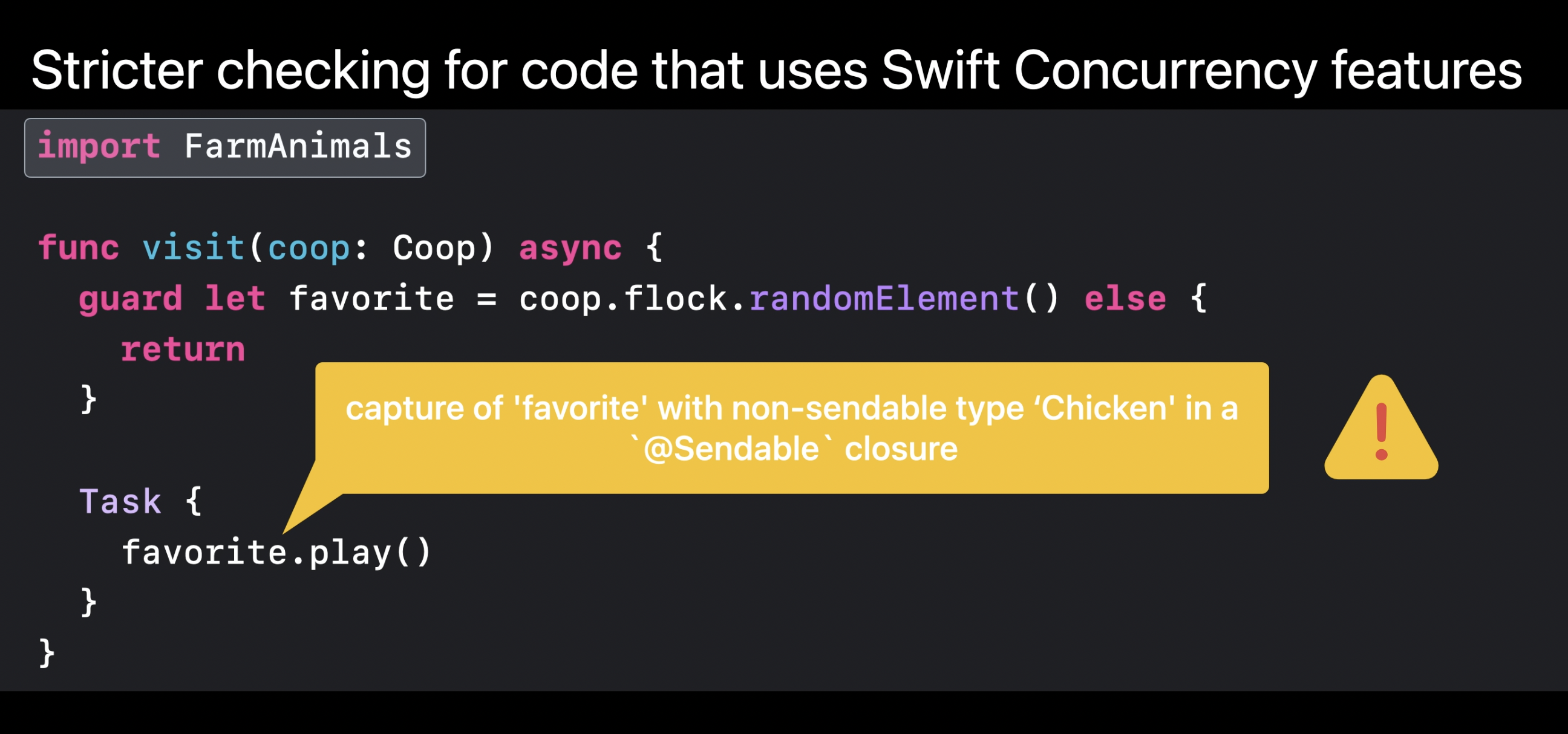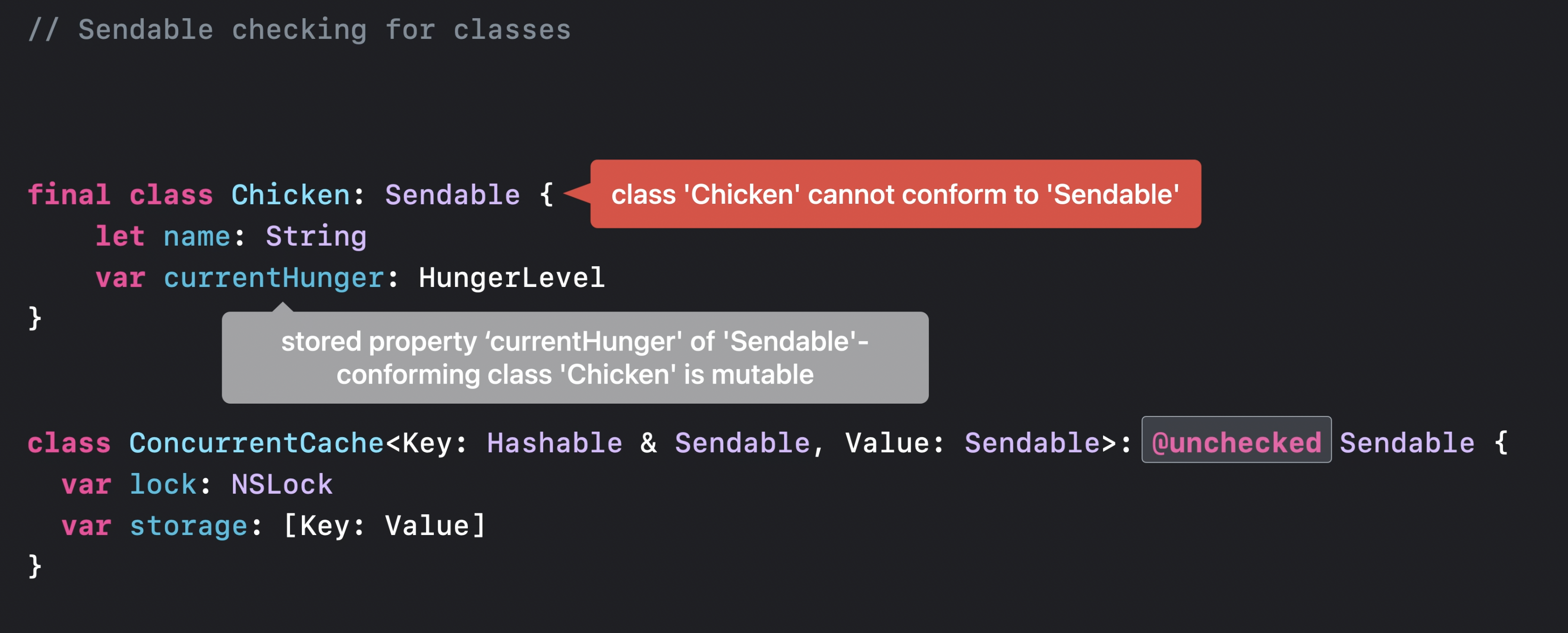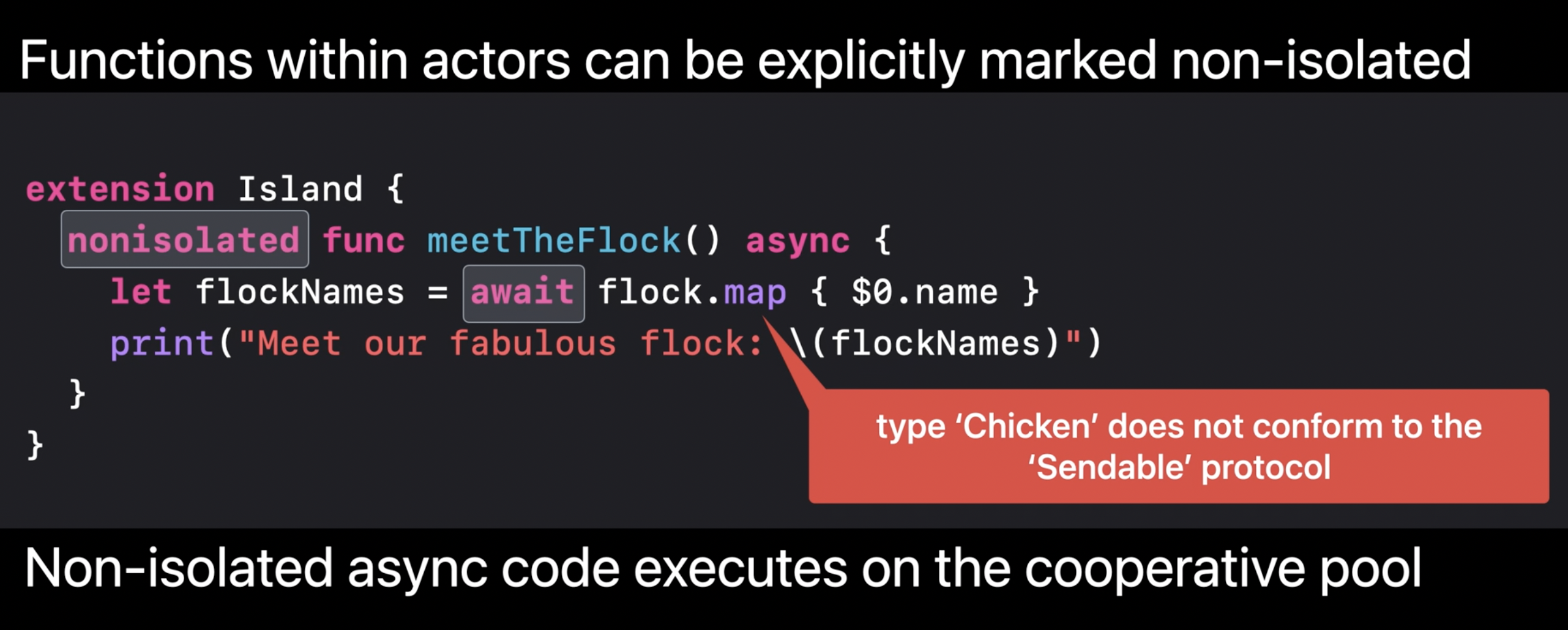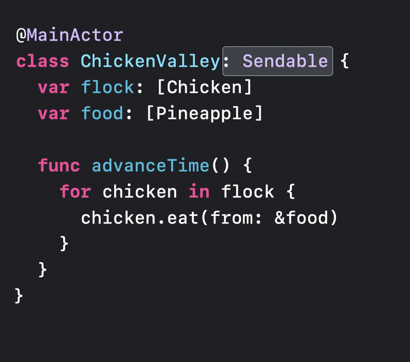 예를 들어 보트에 있는 닭을 섬에 있는 닭 무리에 추가하려 하거나, 섬에서 닭을 입양하여 보트에 가져가려 하면 Sendable 검사를 통해 컴파일러는 두 격리 구역에서 객체를 공유하려는 시도를 차단한다.