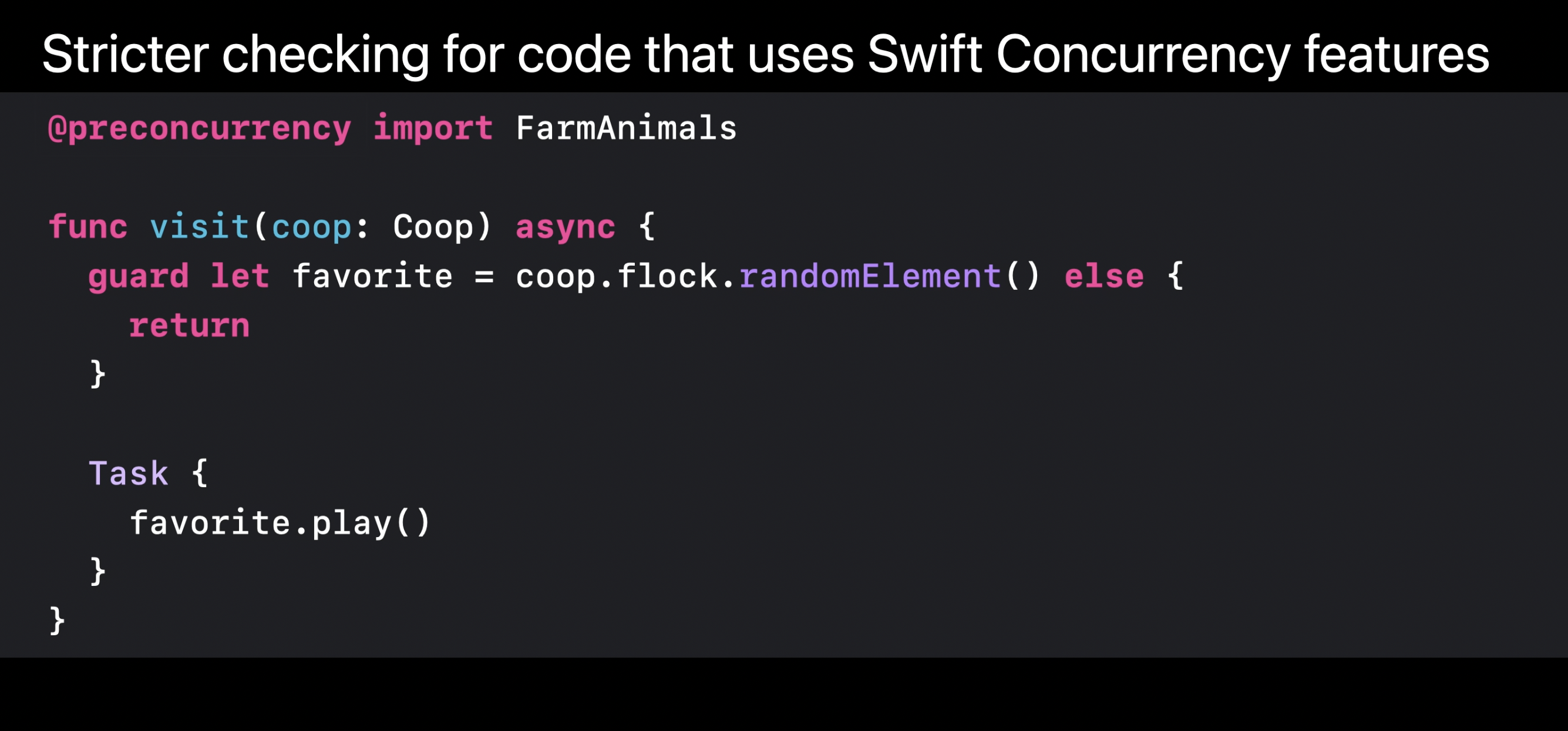 - 또한, 가져온 모듈의 타입에 대한 경고를 제거하기 위해 @preconcurrency 를 사용하는 것에 대한 걱정할 필요는 없다. 그 모듈이 엄격한 동시성 검사를 채택하면, 컴파일러는 새로운 검사를 수행할 수 있다.