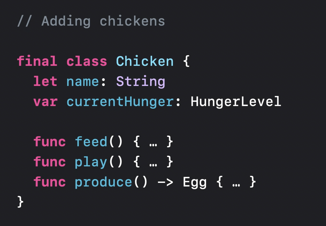 이번에는 닭을 추가해 볼 것이다! 파인애플과 달리 닭은 각자의 성격이 있는 동물이므로, class 타입으로 모델링할 것이다.