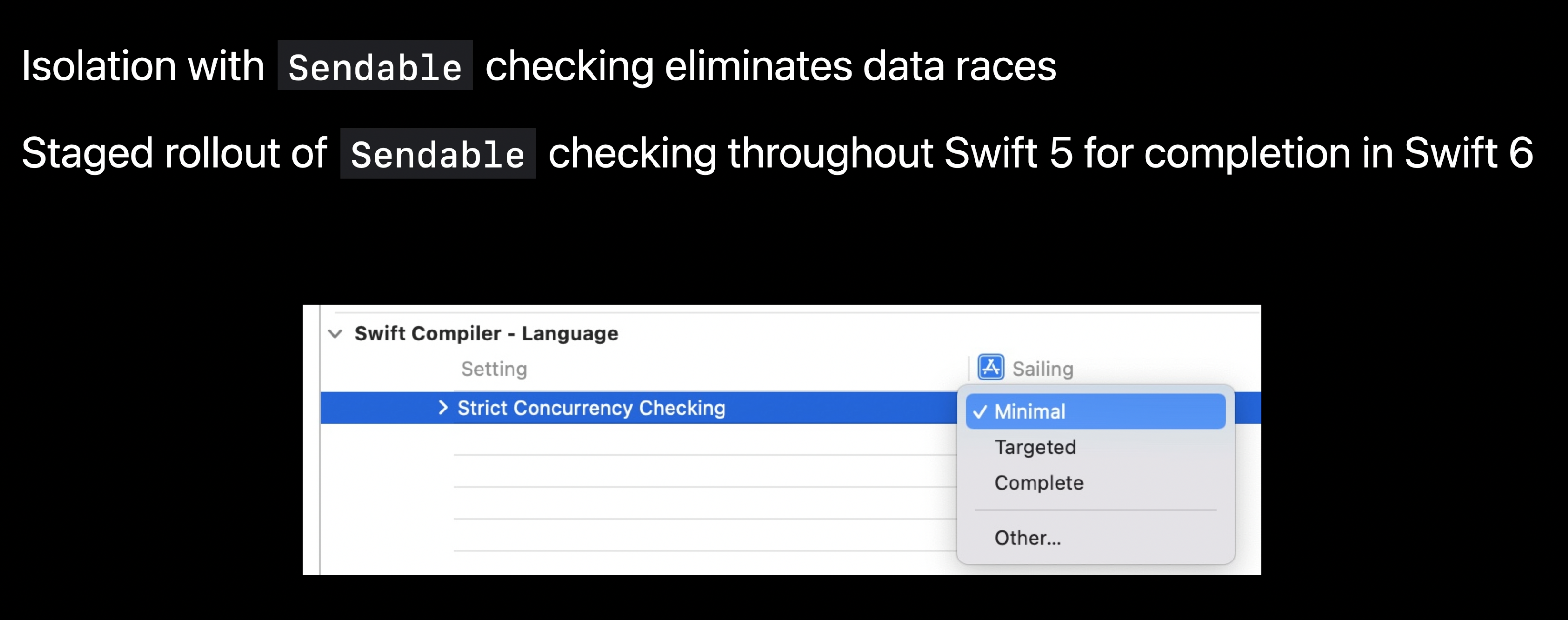 이 설정은 async/await, tasks, 또는 actors와 같은 Swift Concurrency 기능을 이미 채택한 코드에 대해 Sendable 체크를 활성화한다.