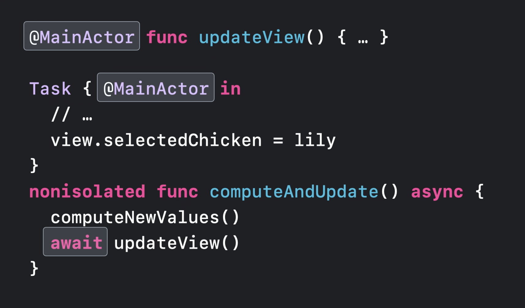 만약 non-isolated 컨텍스트에서 main actor로 메서드(updateView)를 호출하면, main actor 로 전환되는 것을 고려하여 await 을 추가해야 한다.