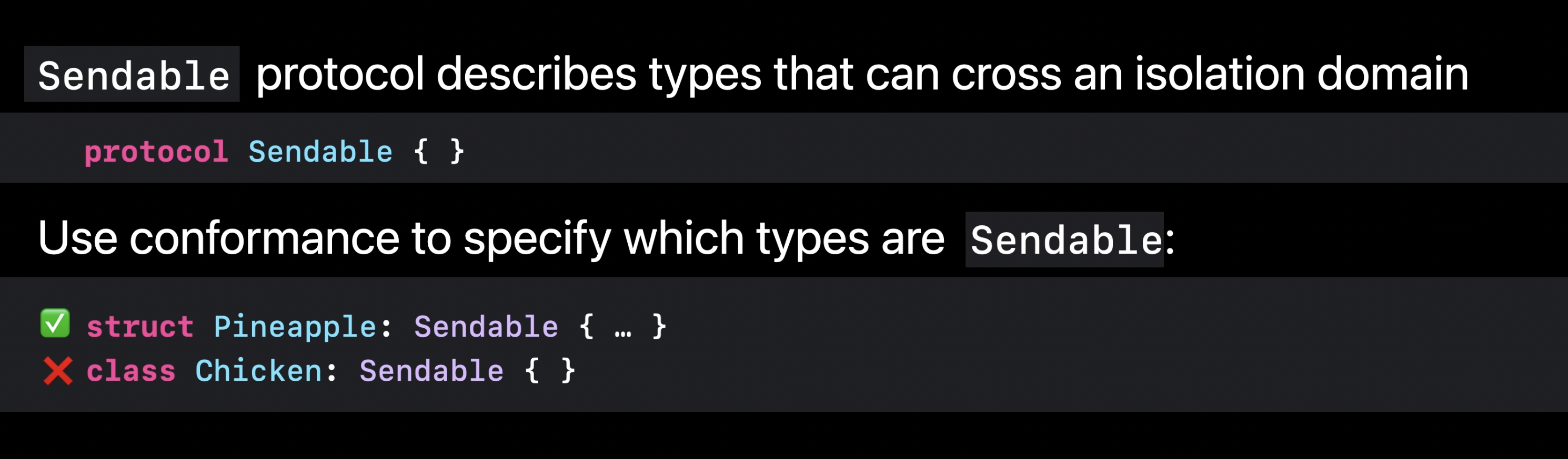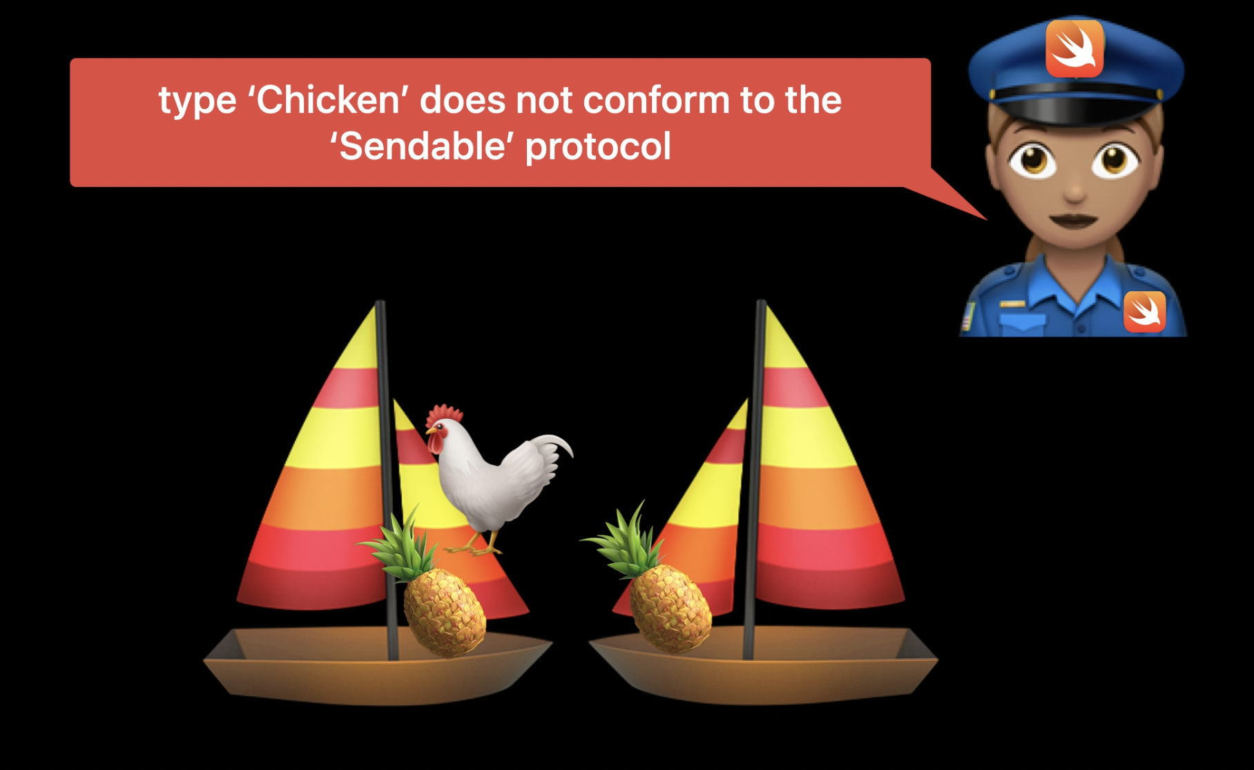 우리는 보트 사이에서 파인애플과 닭을 공유하는 것이 안전한지 구분할 수 있는 방법이 필요하다. 또한 Swift 컴파일러에서도 이를 확인할 수 있는 기능이 필요하다.