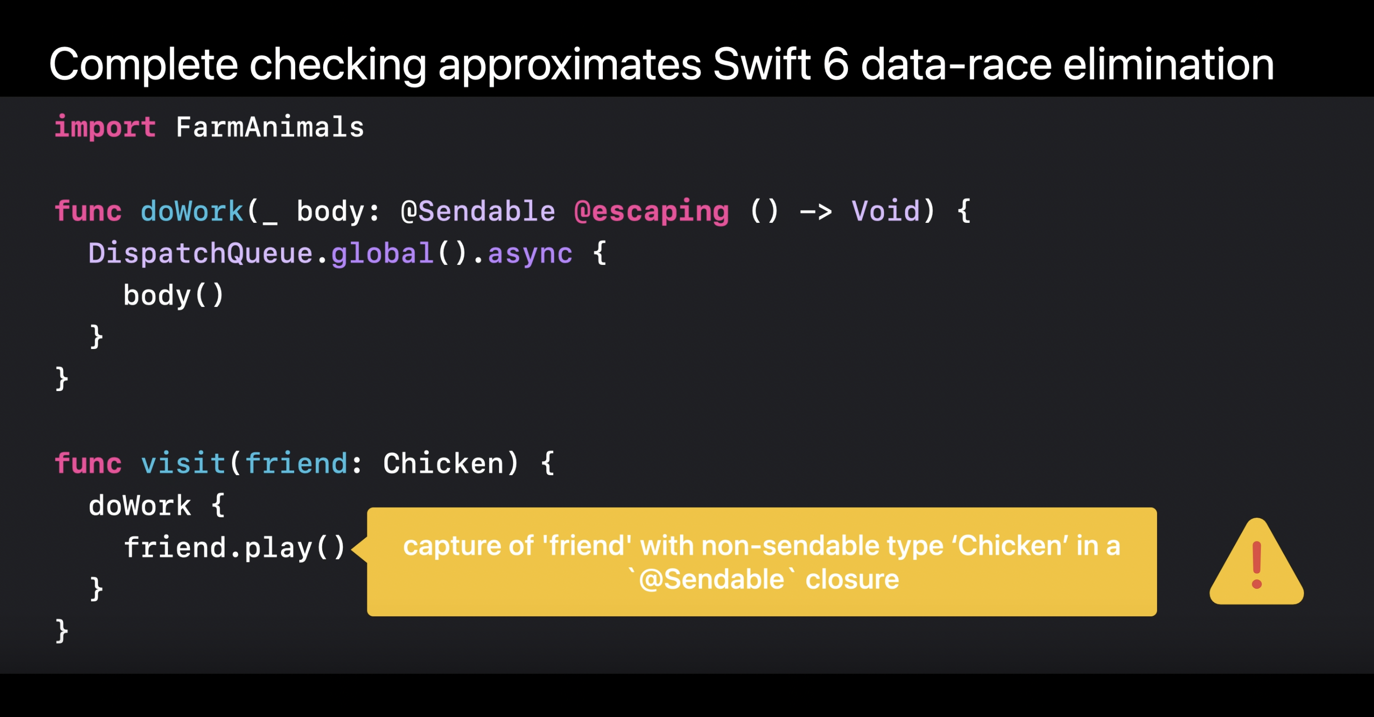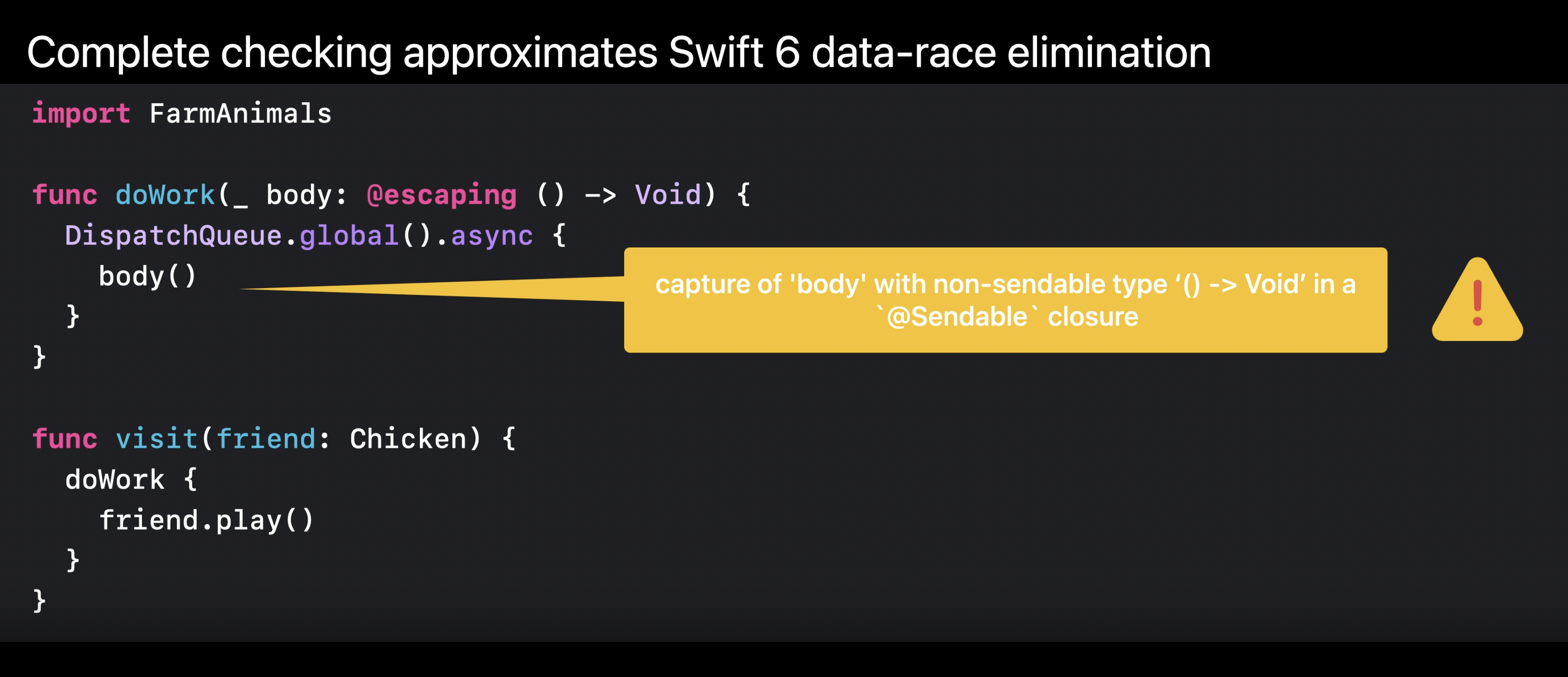 Dispatch queue에서의 async 작업은 실제로 Sendable 클로져를 가져야 하므로, 컴파일러는 non-Sendable인 body()가 dispatch queue에서 실행되는 코드에 의해 캡처될 때 데이터 경쟁이 발생한다는 경고를 생성한다.