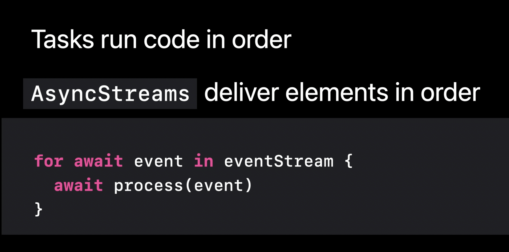 AsyncStream은 실제 이벤트 스트림을 모델링하는 데 사용할 수 있다. 하나의 Task가 for-await-in 루프를 통해 스트림의 이벤트들을 반복하면서 각 이벤트를 차례대로 처리할 수 있다.