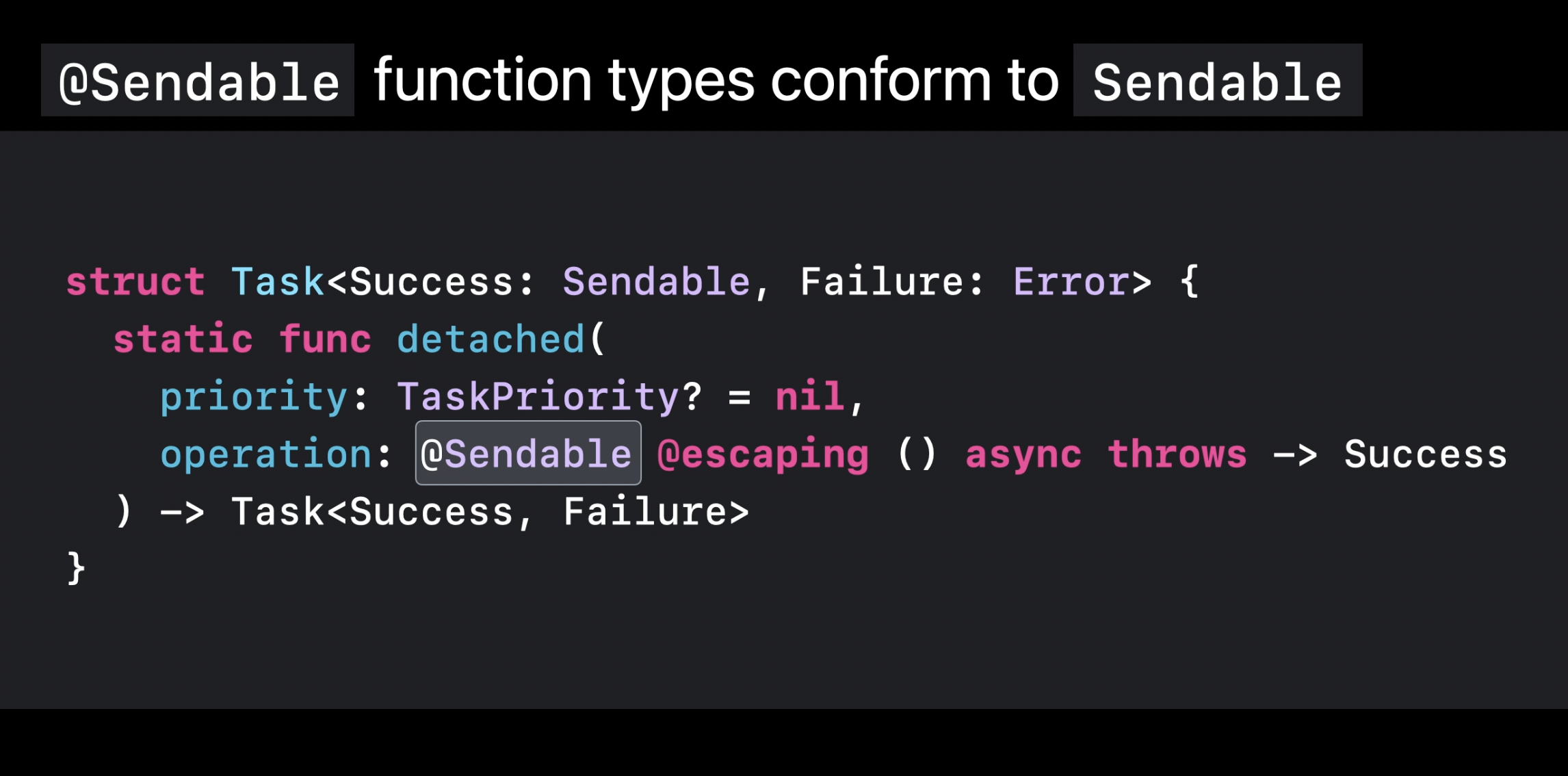 일반적으로 함수 타입은 프로토콜을 준수할 수 없지만, Sendable은 컴파일러가 의미적으로 요구사항을 확인하기 때문에 특별하다.