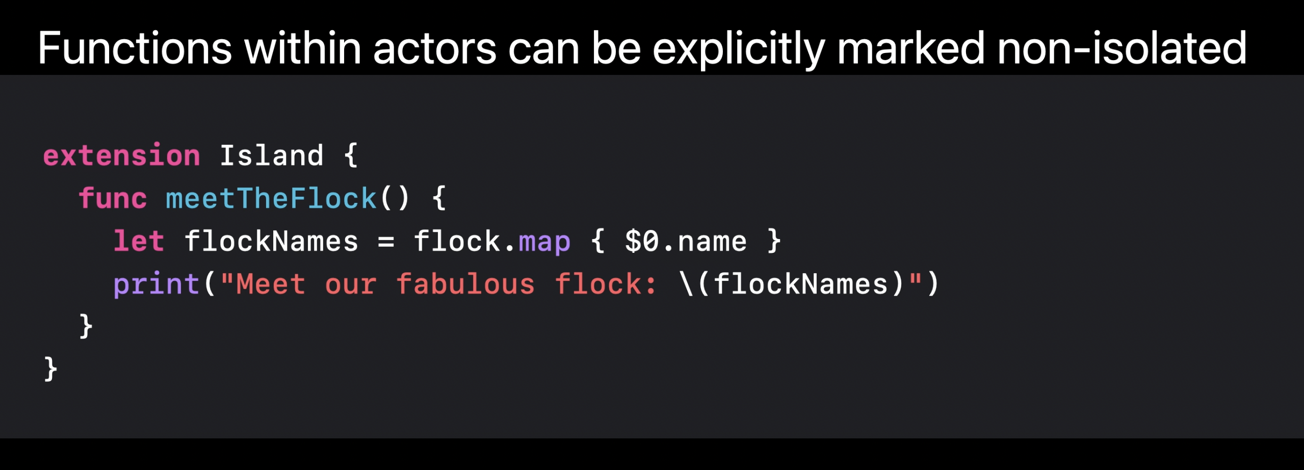 actor 내부의 함수를 non-isolated 키워드를 사용하여 actor 외부로 옮길 수 있다.