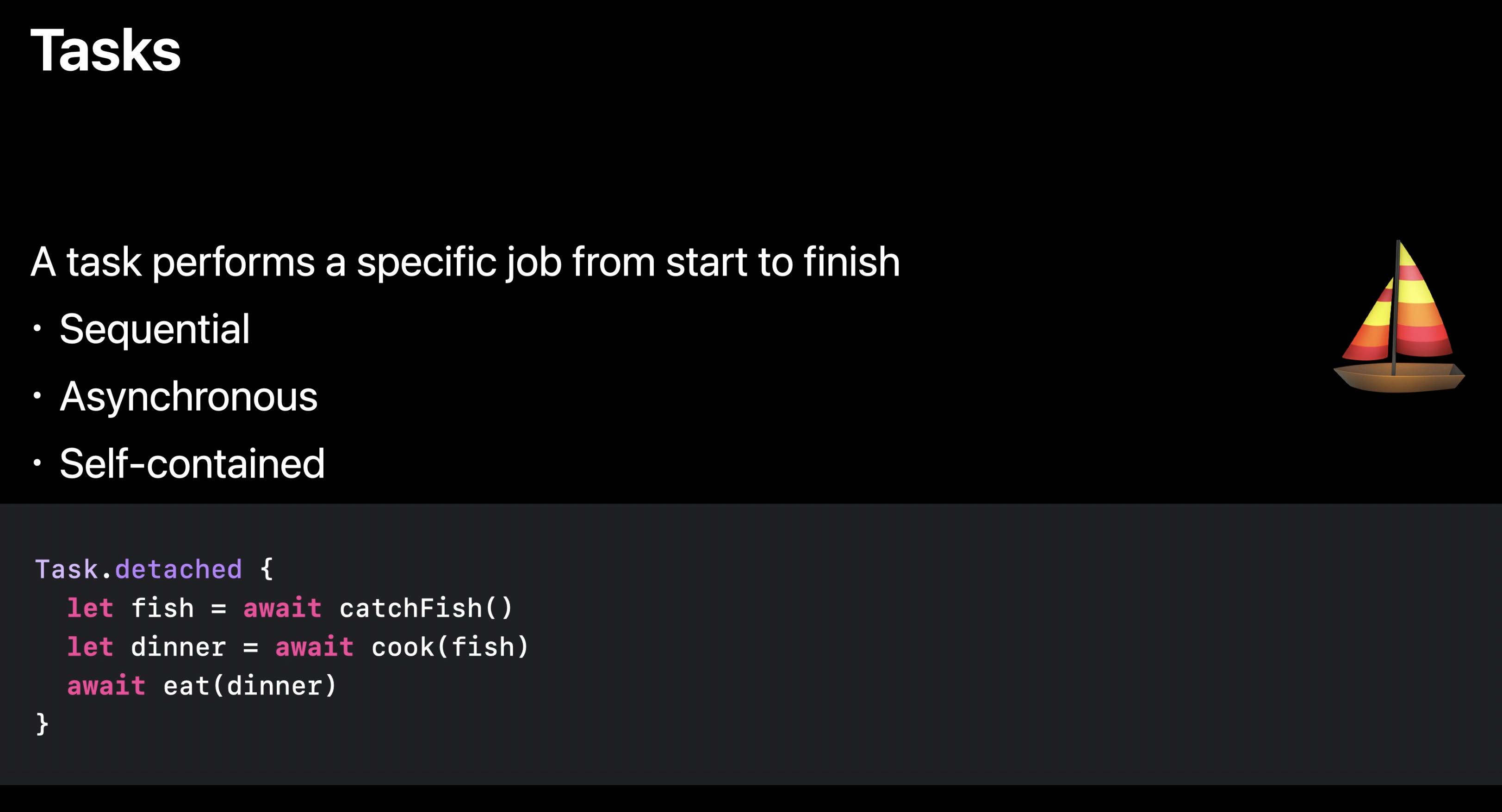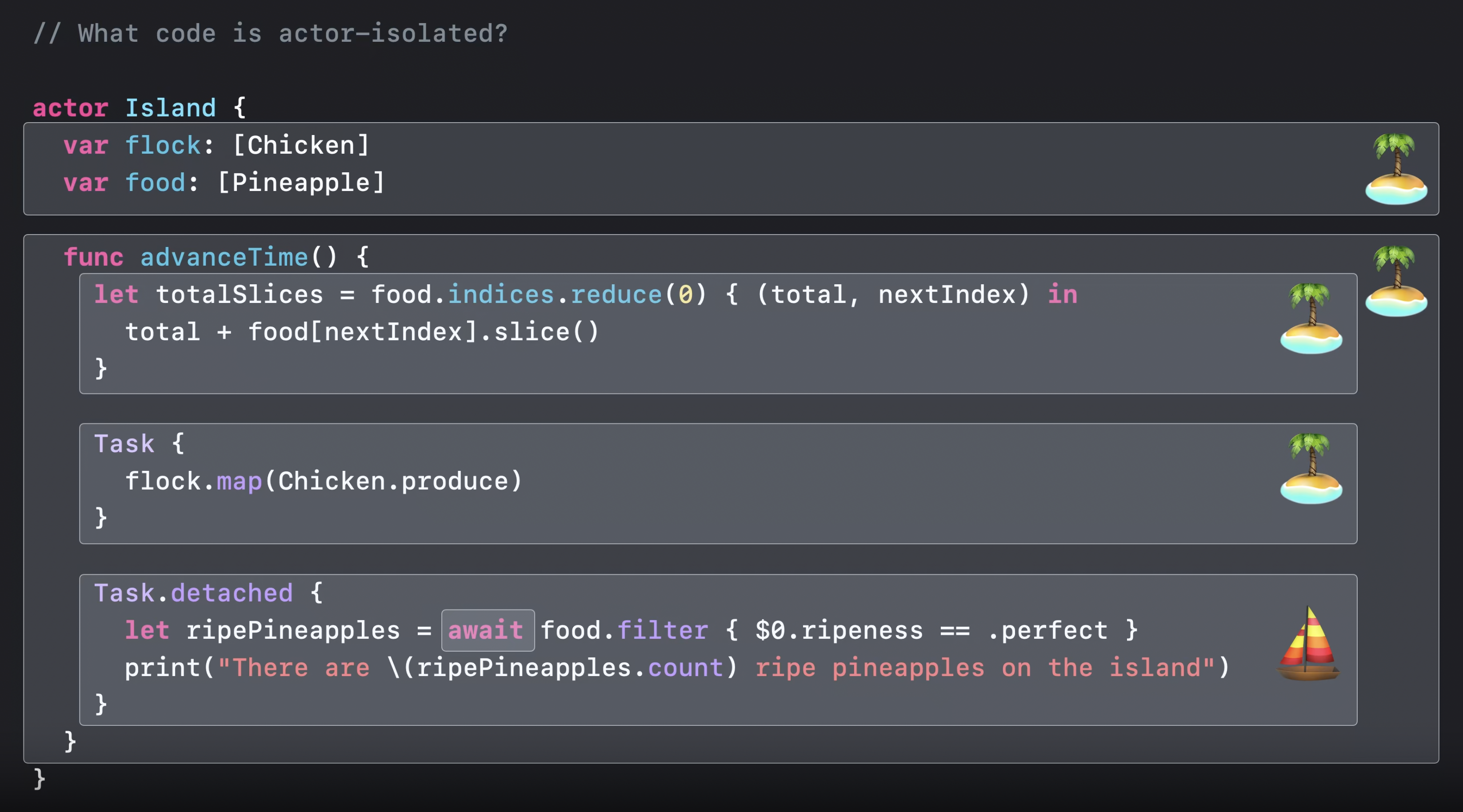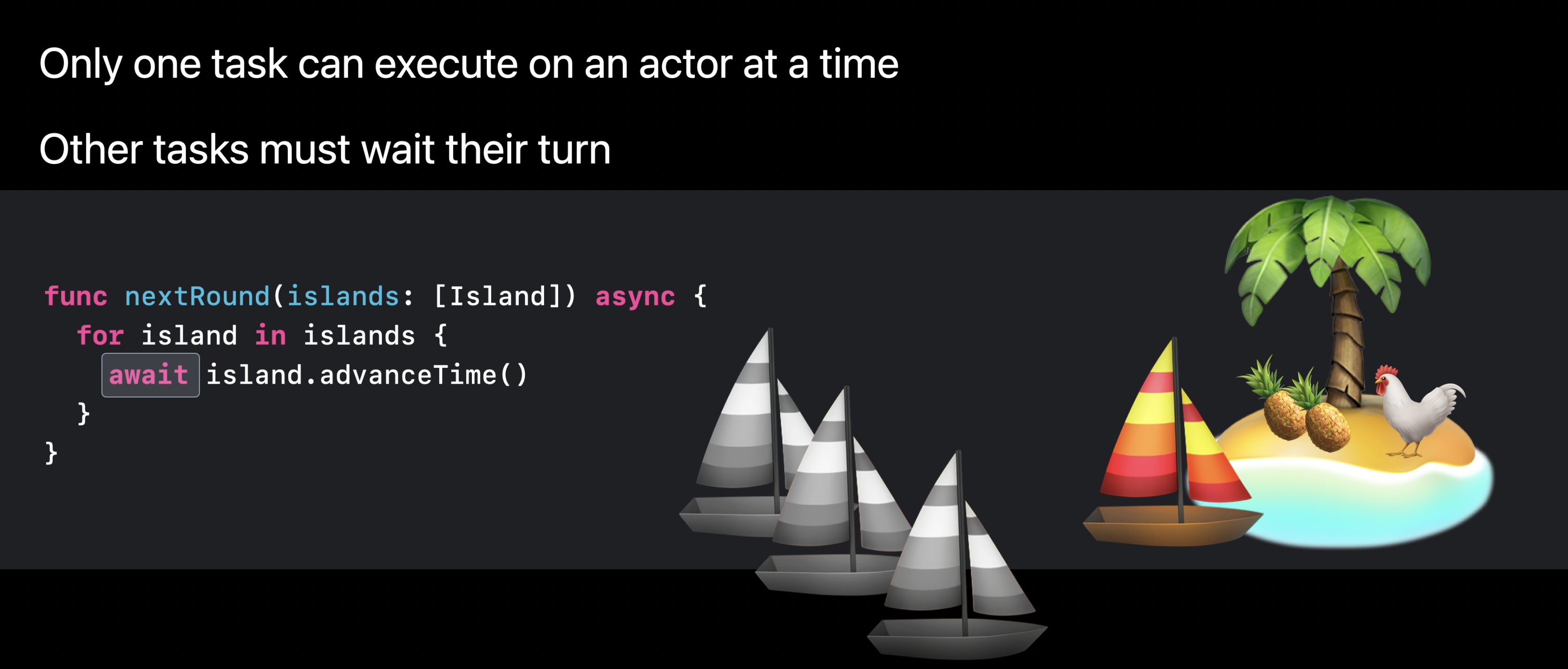 그리고 주어진 보트가 섬을 방문할 기회를 얻기까지 오랜 시간이 걸릴 수 있기 때문에 actor에 await 으로 표시된 잠재적인 정지 지점을 표시한다.