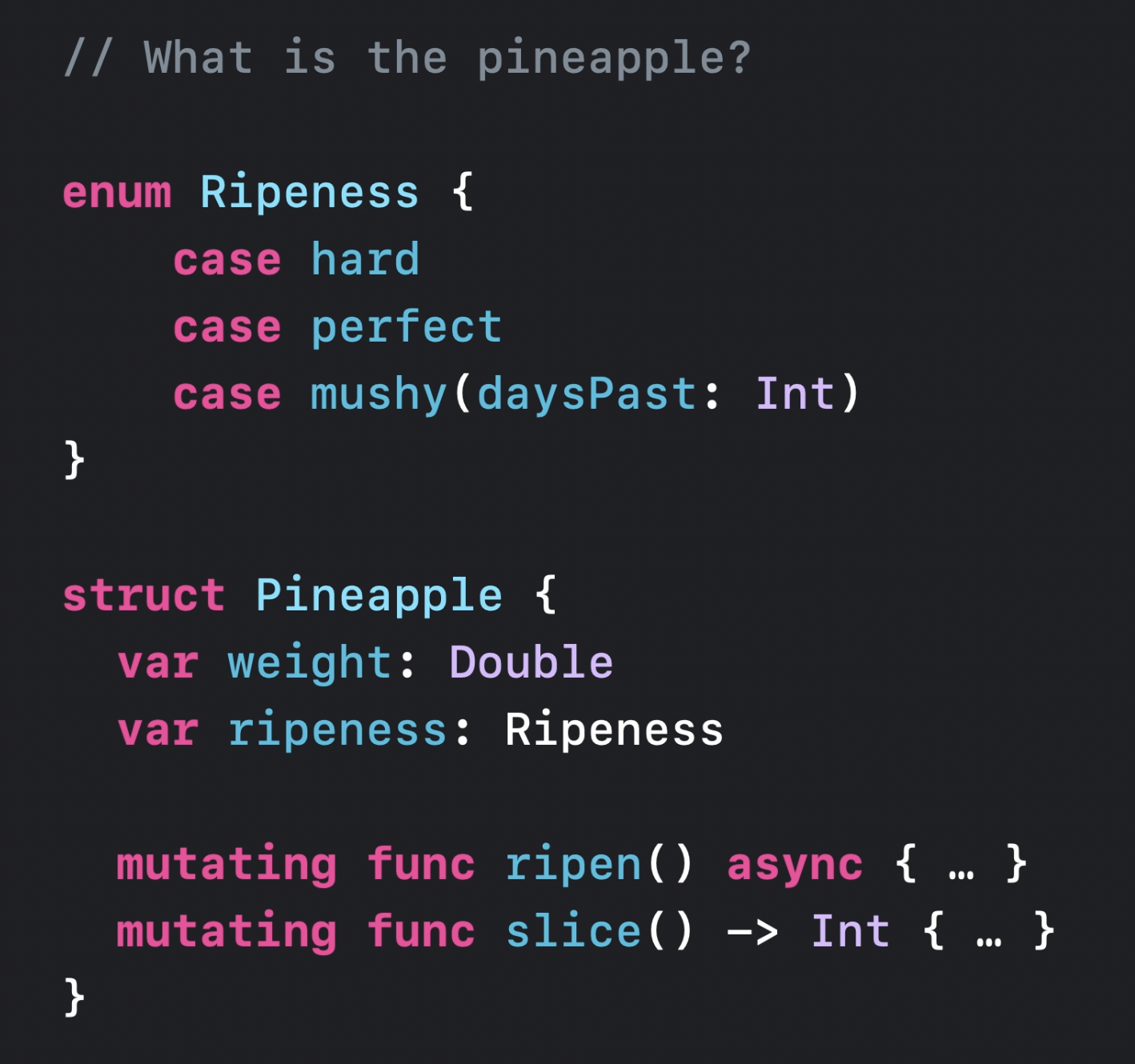 Swift에서는 이 데이터를 나타내는 몇 가지 방법이 있는데, 주로 값타입을 선호하기 때문에 무게와 숙성 상태를 정의한 struct타입의 파인애플을 만들어 볼 것이다.