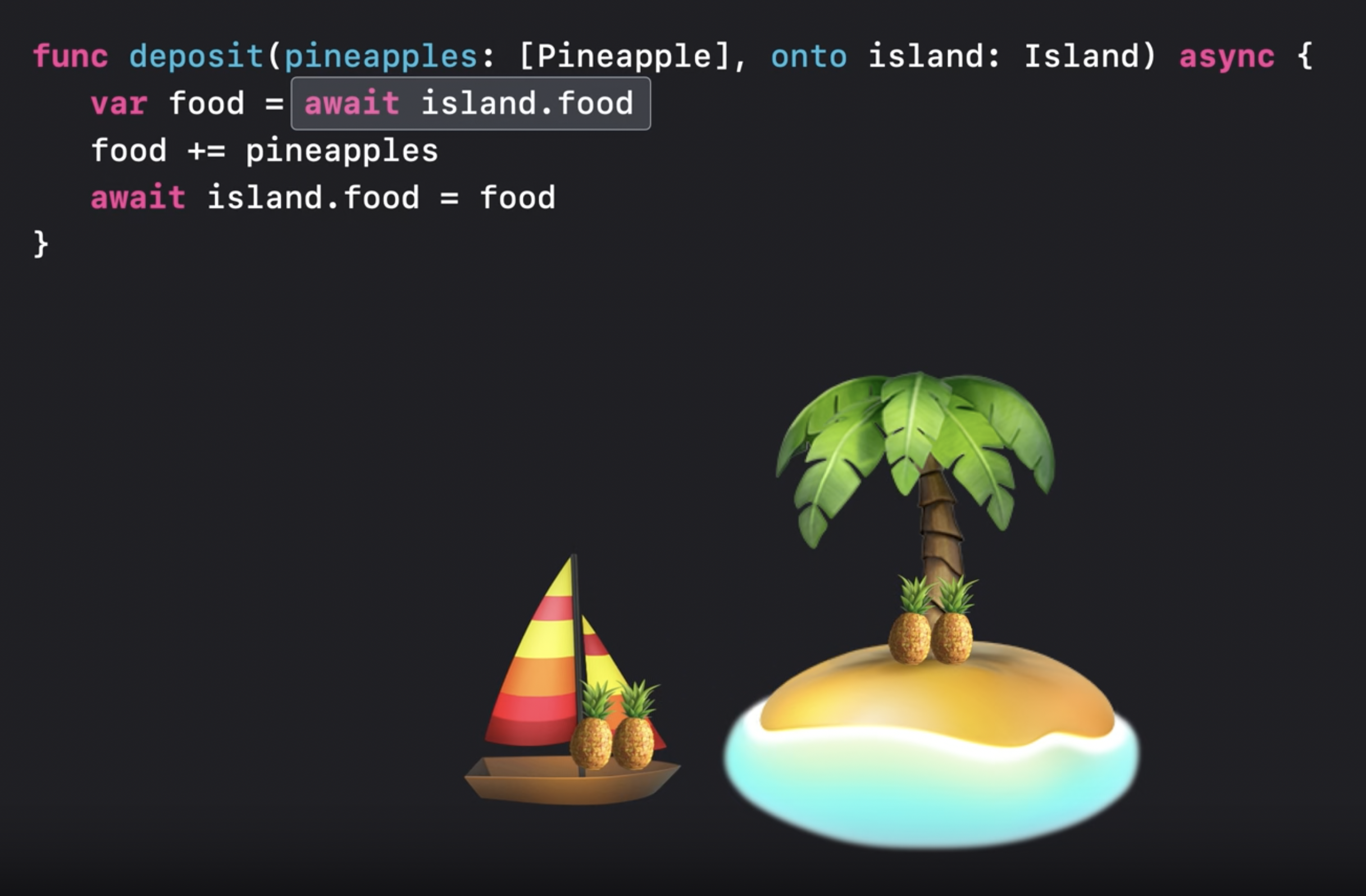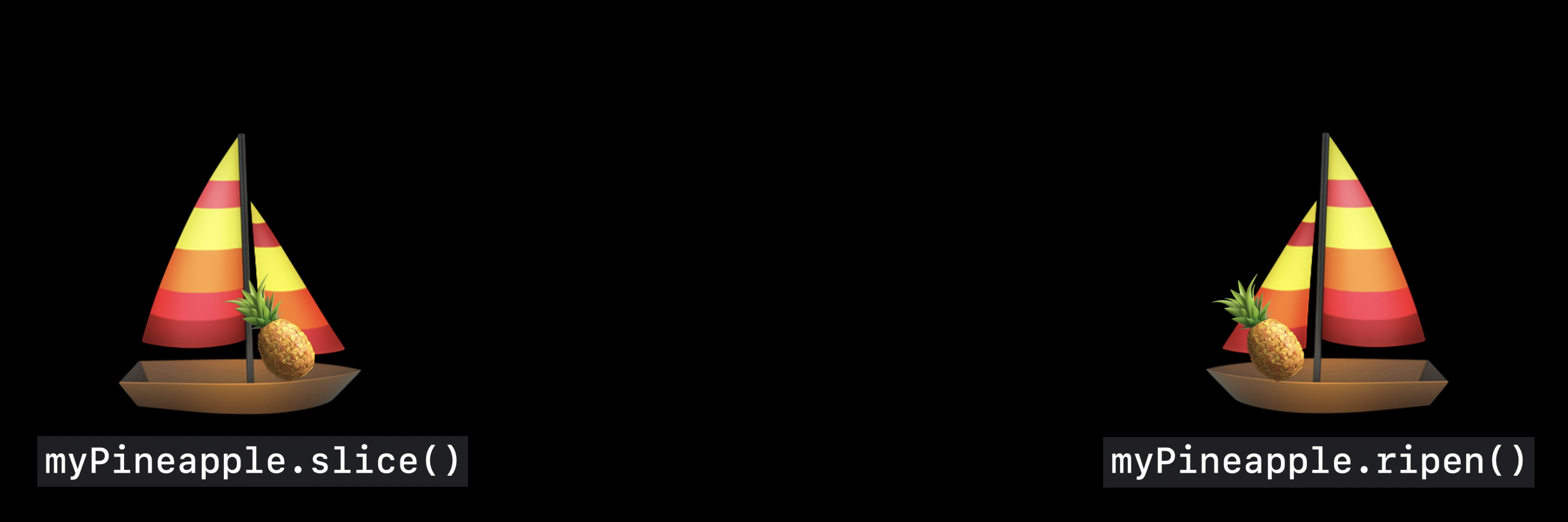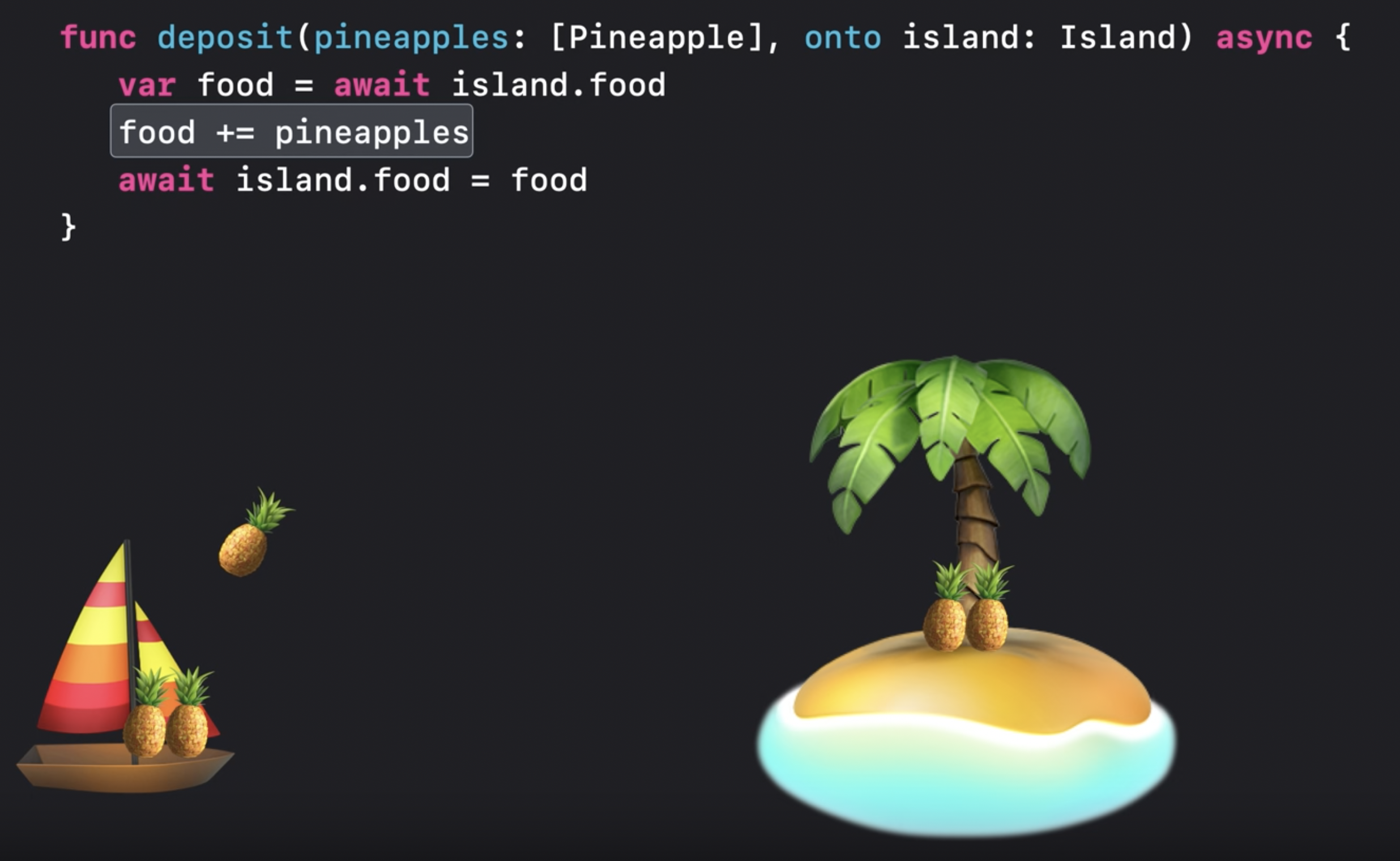 여기서 현실에서의 비유가 약간 깨진다. Swift에서 파인애플은 한 보트에서 다른 보트로 옮겨지는 물리적인 물건이 아니고 데이터 타입이기 때문이다.