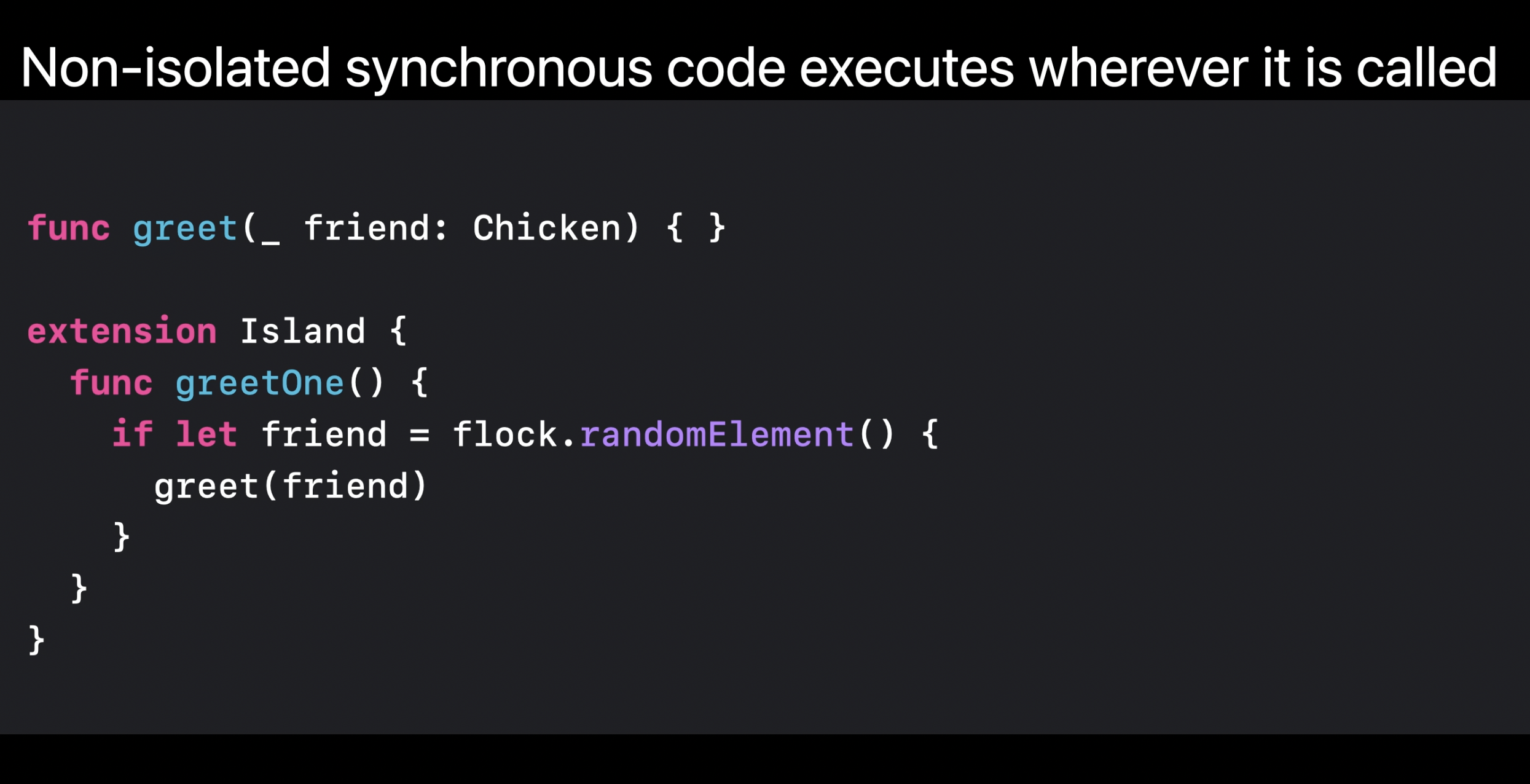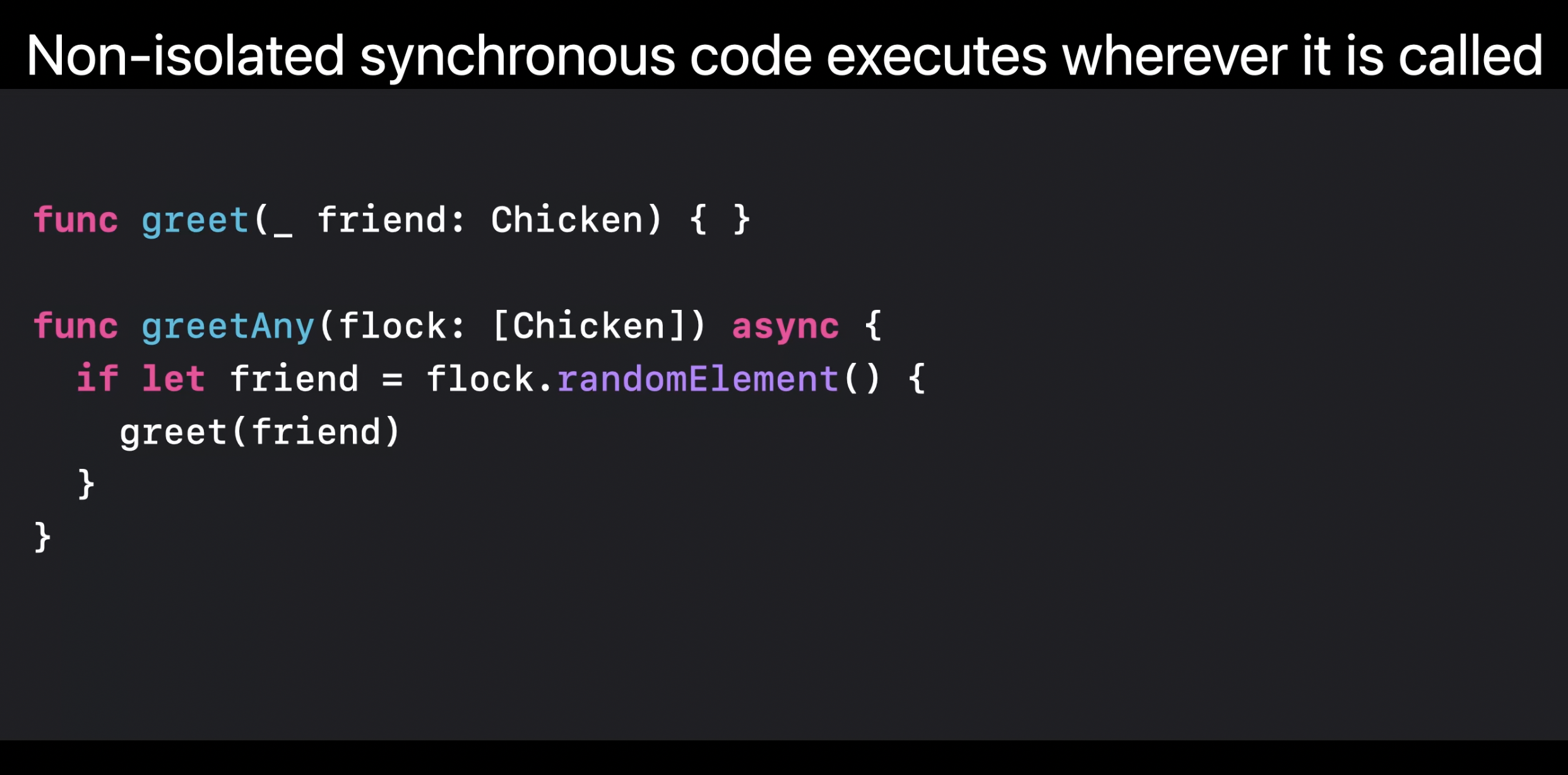 greetOne 메서드는 actor-isolated이다. 이 동기 코드는 섬에서 호출되기 때문에 flock에 접근하여 Chicken을 처리하는데 자유롭다.