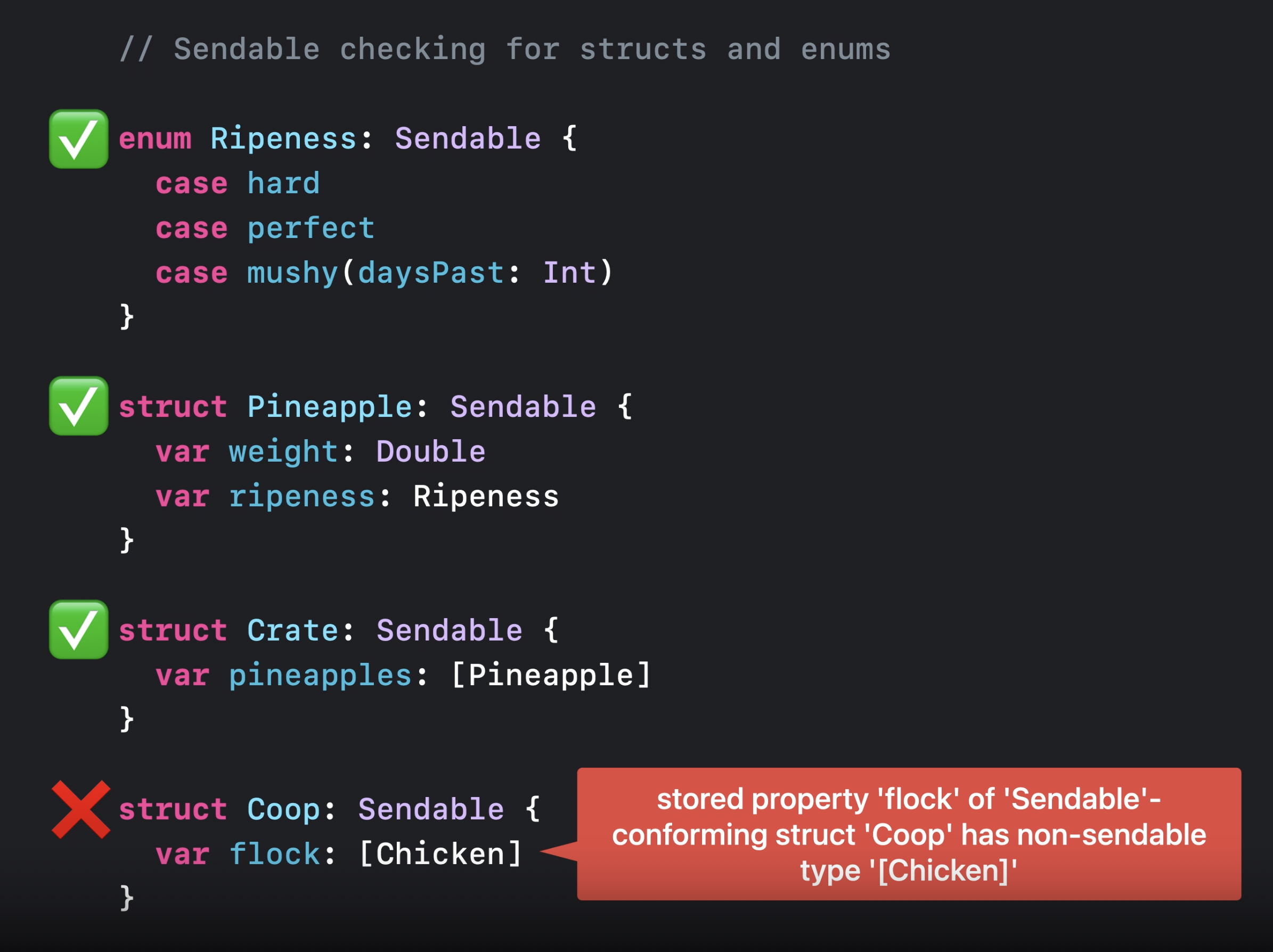 파인애플은 Sendable을 준수하기 때문에 자유롭게 교환할 수 있으나, 닭을 교환하려는 경우 불가능하다고 컴파일러가 알려준다.