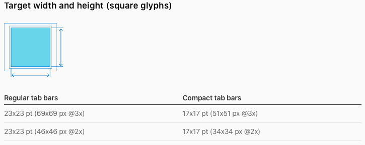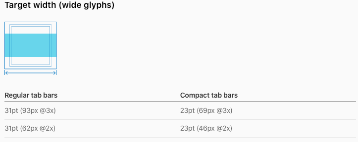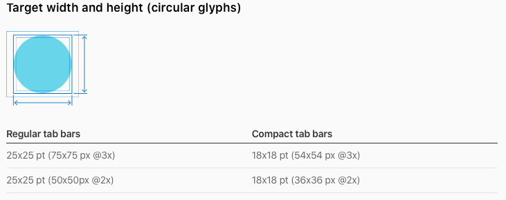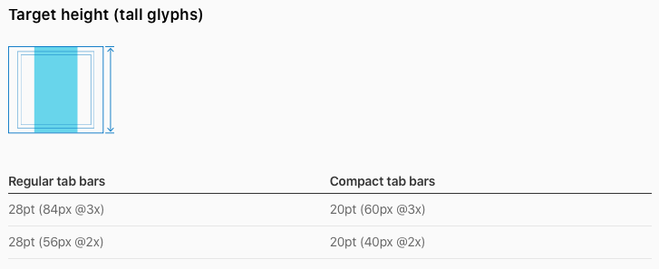 만약 custom tab bar glyph를 만들어야 하는 경우 일반 환경과 compact환경에서 모두 잘 보이도록 두 가지 크기로 만들어야 한다. 다양한 모양에 따라 아래 metric을 따라서 만들어야 한다.