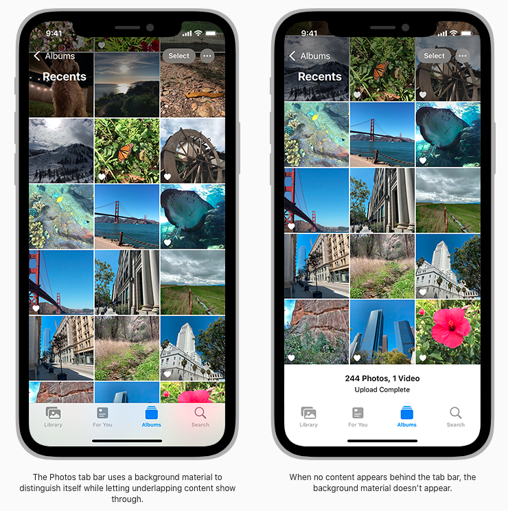 기본적으로 탭 막대는 반투명하다. 콘텐츠가 뒤에 나타날 때만 반투명(?) 형식으로 배경 자료를 사용하고 보기가 맨 아래로 스크롤될 때는 반투명을 제거한다. 키보드가 화면에 표시되면 tab bar는 숨겨진다.