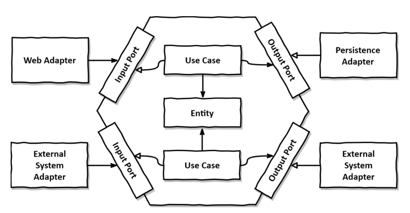 모든 의존성은 코어(도메인 엔티티)를 향한다. 육각형 바깥에는 애플리케이션과 상호작용하는 다양한 어댑터들이 있다.